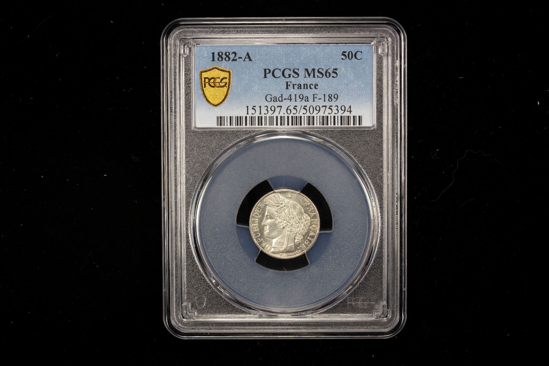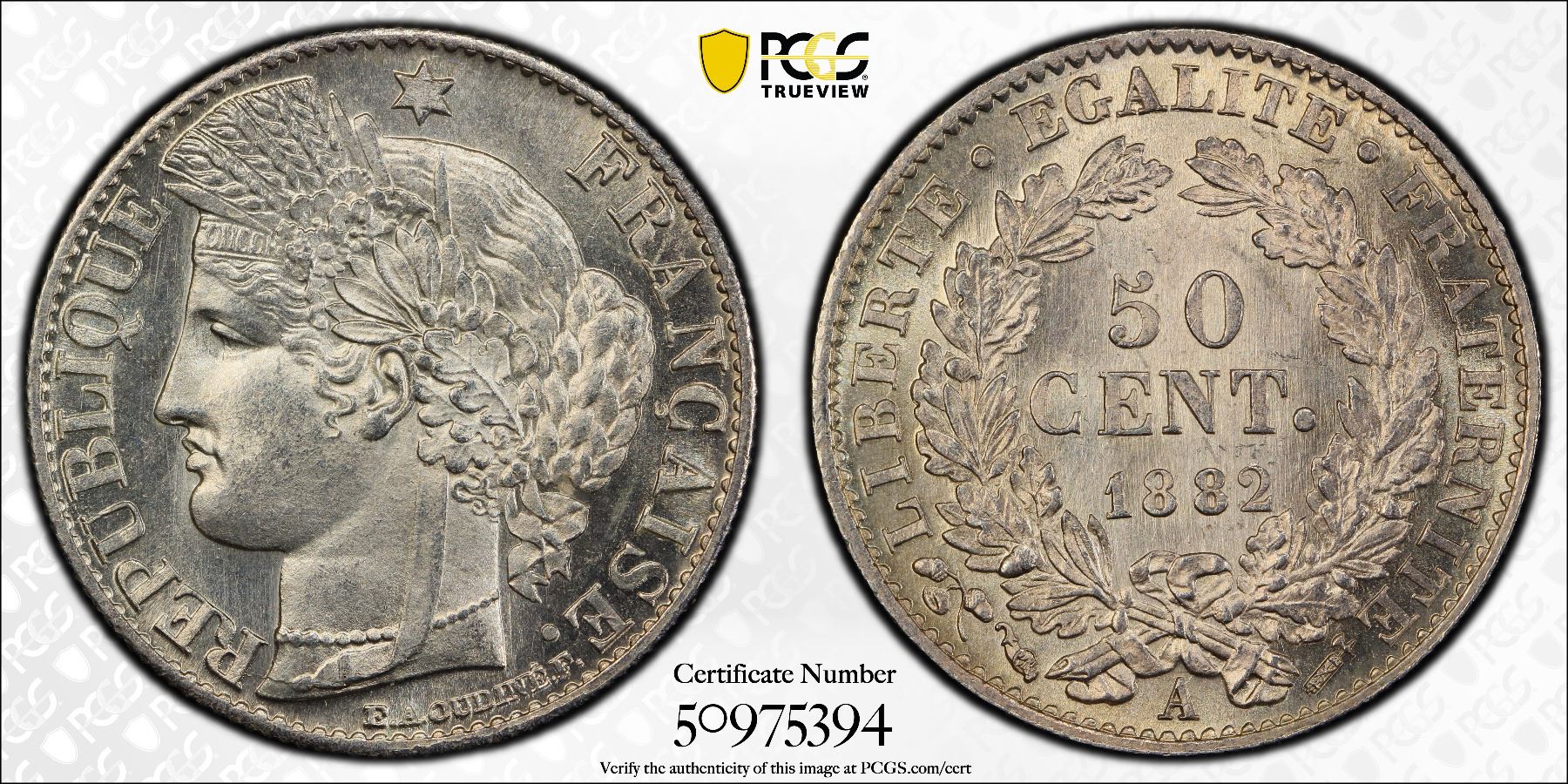 FRANCE: Third Repuiblic, AR 50 centimes, 1882-A, KM-834.1, Gad-419a, F-189, a superb lustrous example! PCGS graded MS65.