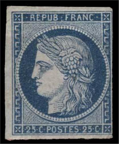 1849-52 imperf 25c pale blue (SG 12), unused, 3 large to very large margins, tiny to touching on the fourth, pressed out diagonal crease at lower right corner and with signature in pencil on reverse, scarce, cat £3750