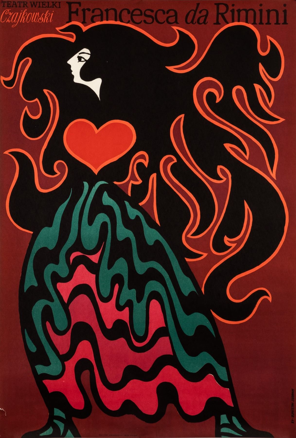 Polish concert poster for the Polish symphony performance of 'Francesca da Rimini' by Tchaikovsky, artwork by Hilscher, 1968, 39 x 25 inches. 1-inch tear at bottom right edge, else very good.