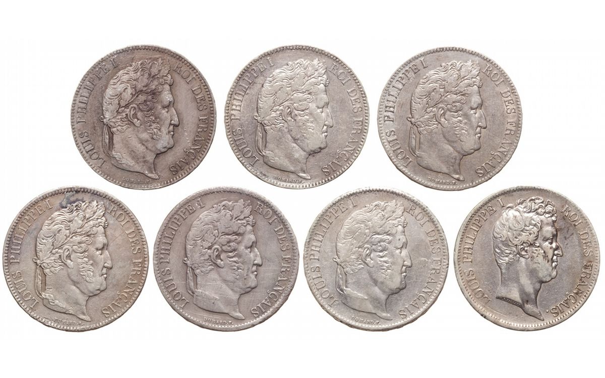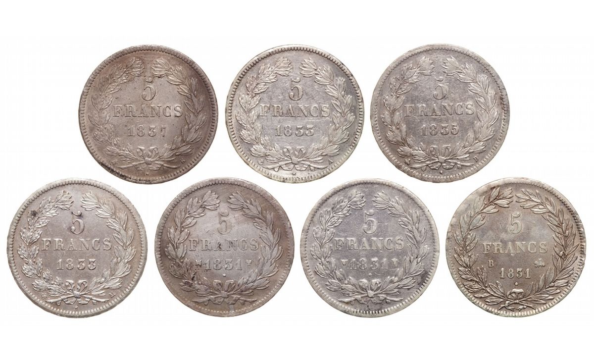 Francs 1831-1851/1833-1837. 745 (var.s). Louis Phillipe I. Very Fine or better/About Extremely Fine. 5 Francs x 3, 1851B (Rouen, incuse); 1831W (raised) and 1831 MA (Marseilles, raised) (KM#745.2/745.10/745.13)/5 Francs x 4, 1833A (Paris), 1833Q (Perpigna