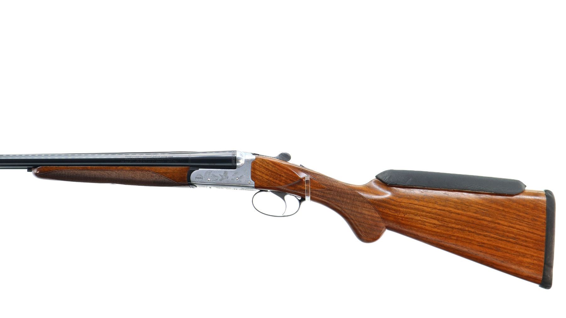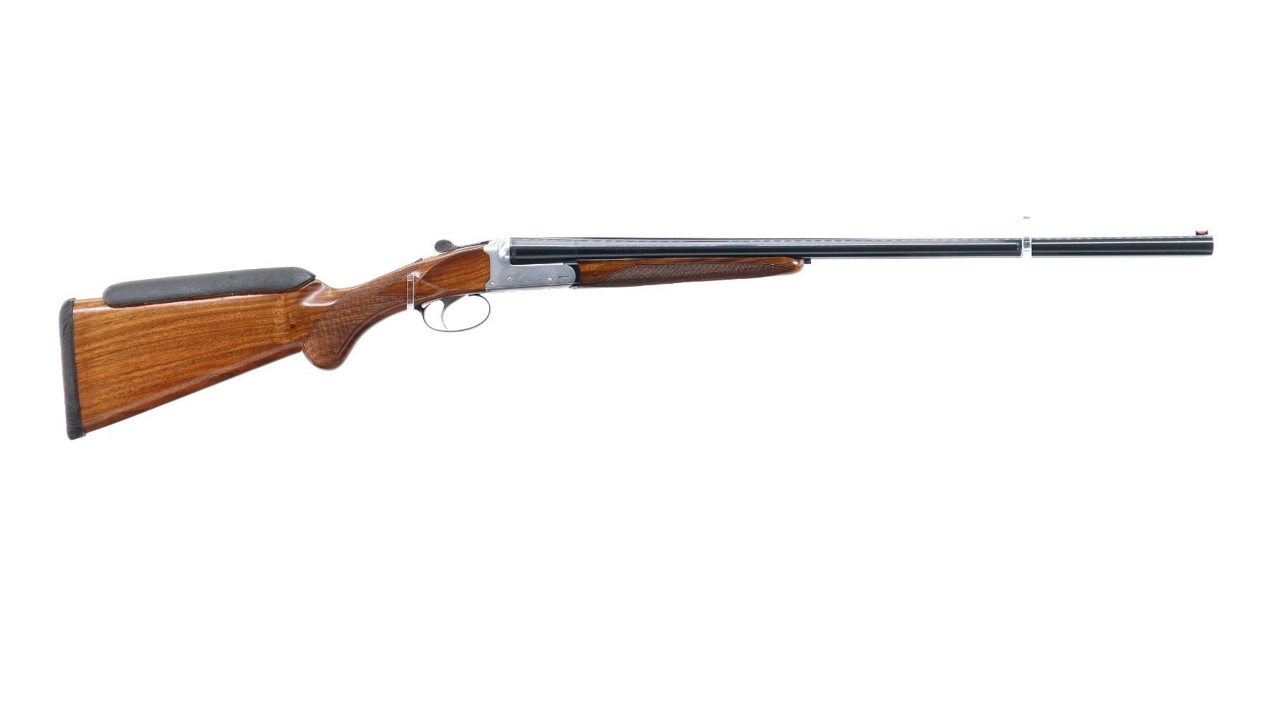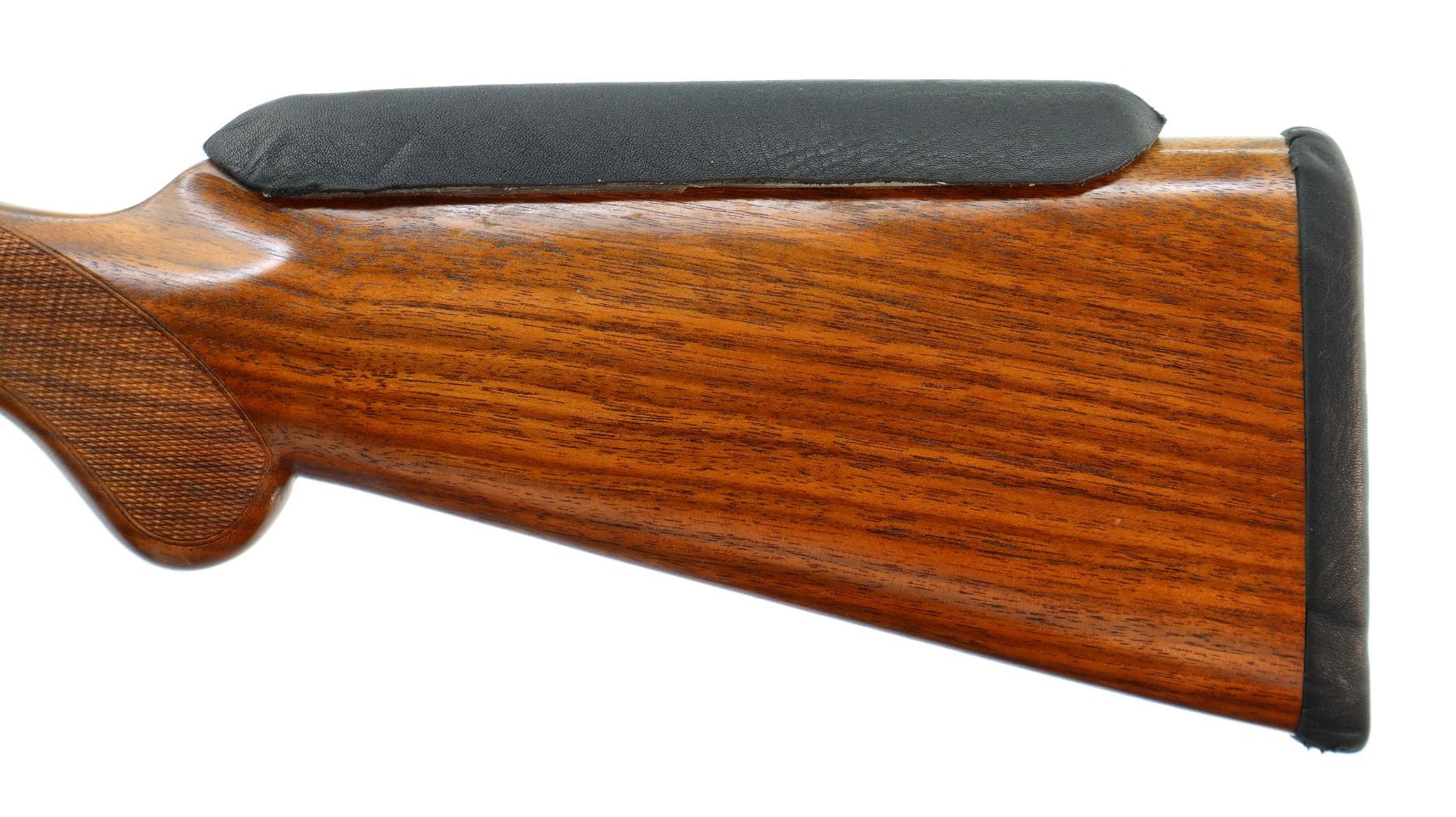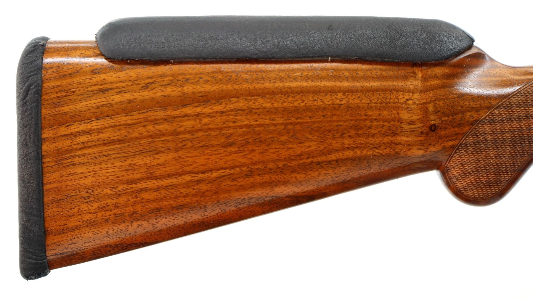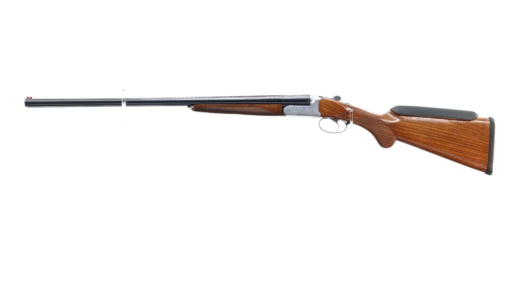 Main Description: Red fiber optic front bead, polish blued barrels with raised rib, manual safety, ejectors, single silver mechanical trigger. Two piece wood stocks, checkered forearm and pistol grip, added on black leather comb using silicon, black covered recoil pad, 14.5" LOP.