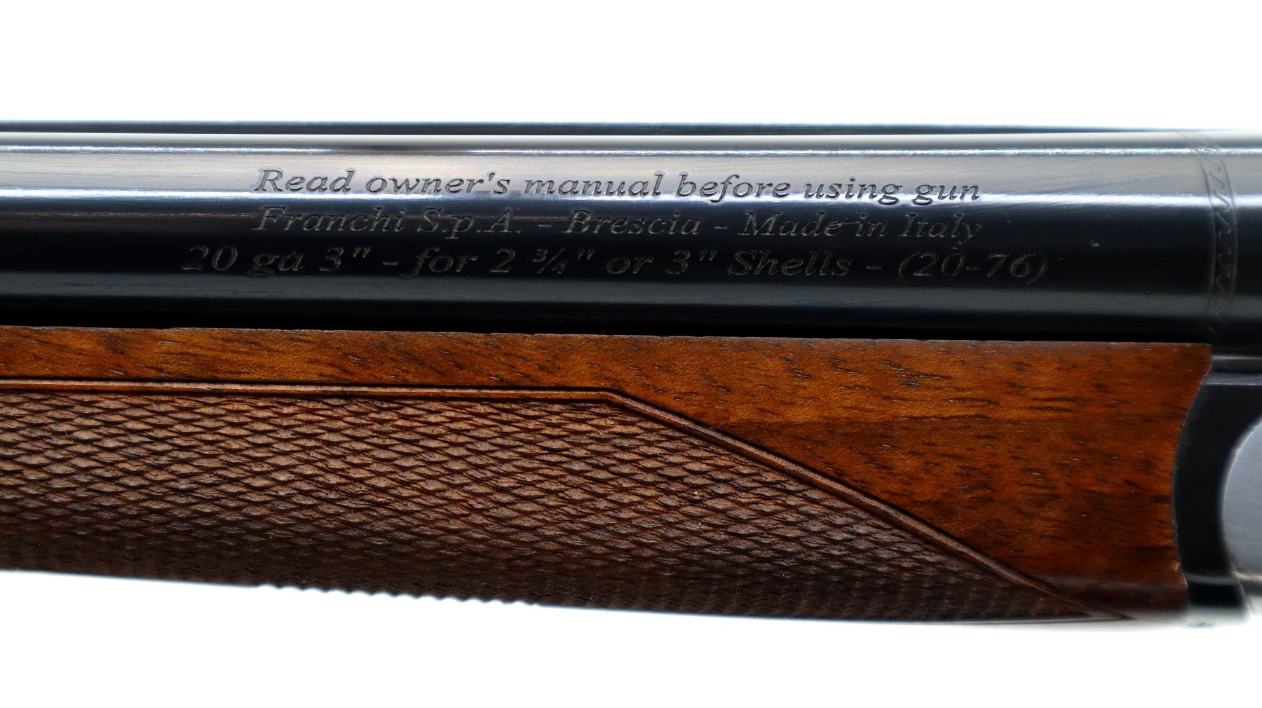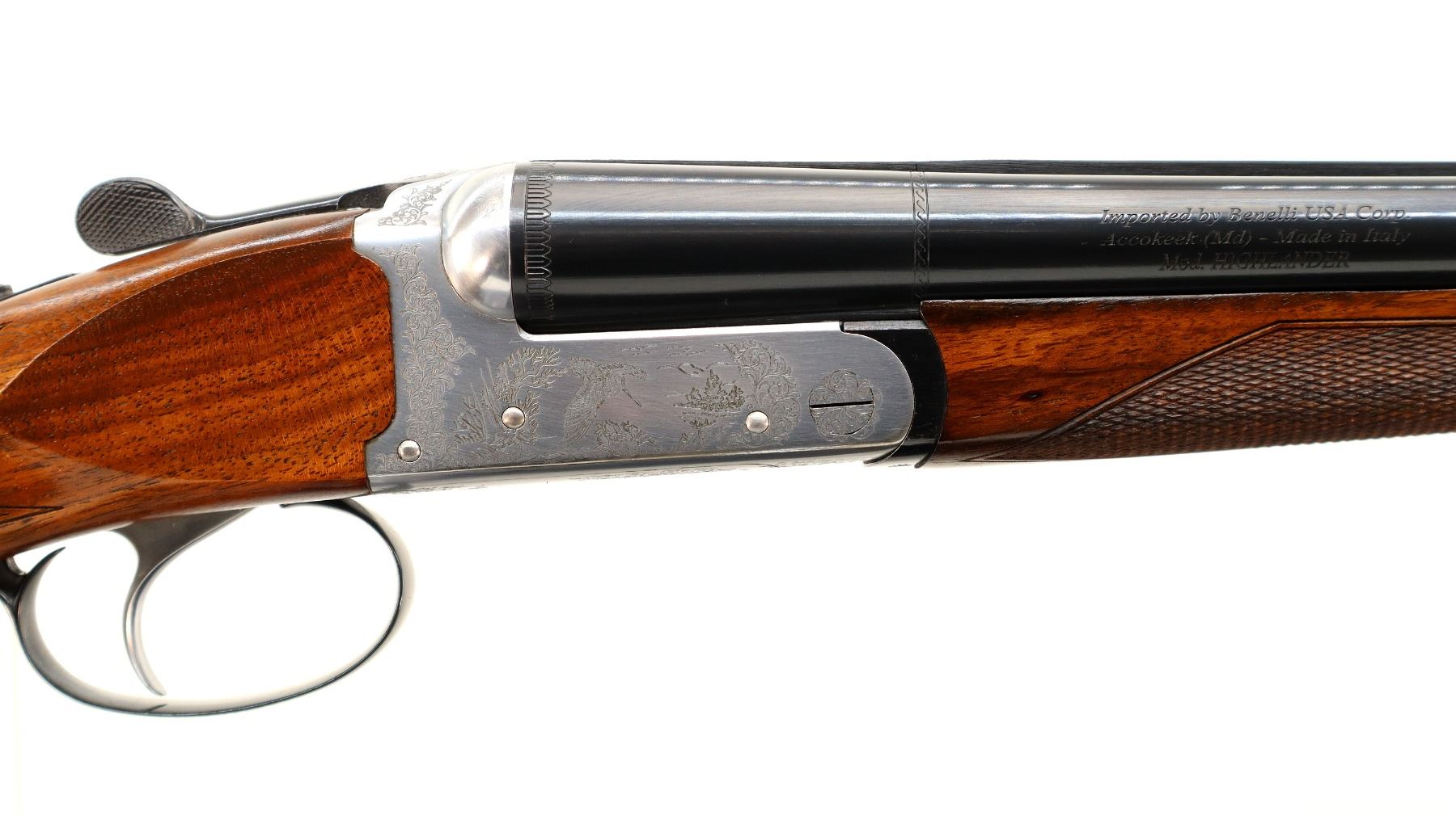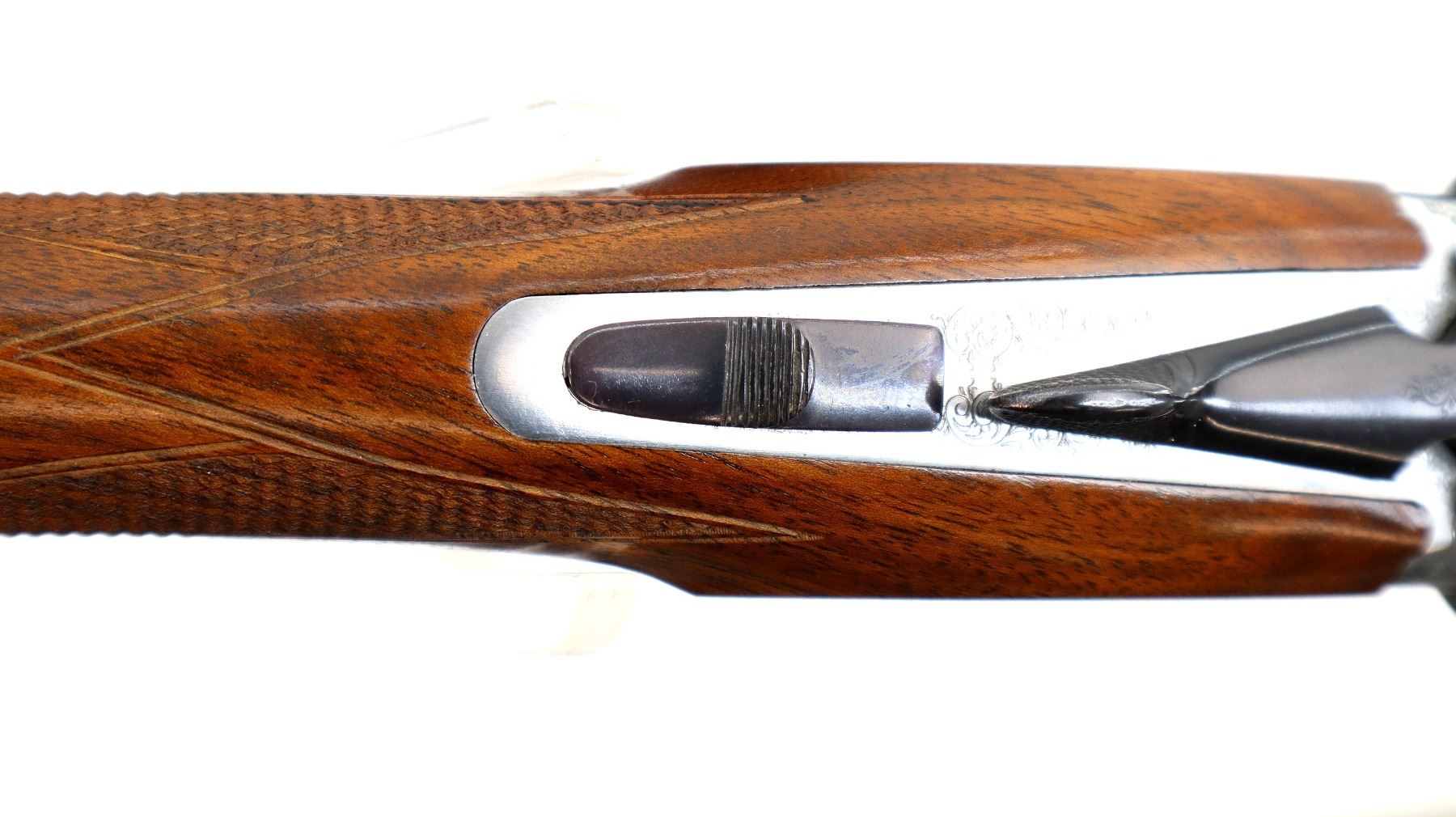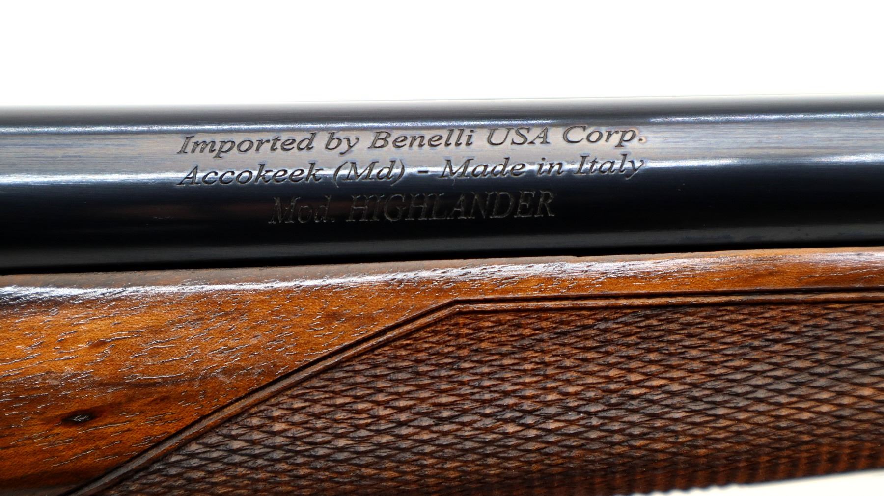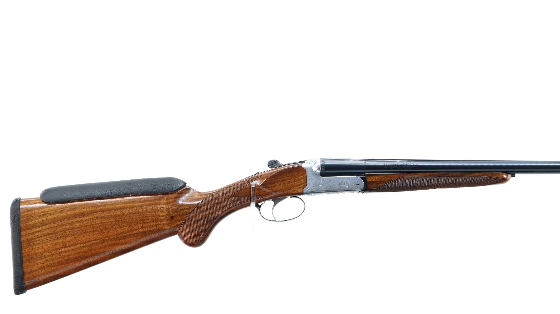 Main Description: Red fiber optic front bead, polish blued barrels with raised rib, manual safety, ejectors, single silver mechanical trigger. Two piece wood stocks, checkered forearm and pistol grip, added on black leather comb using silicon, black covered recoil pad, 14.5" LOP.