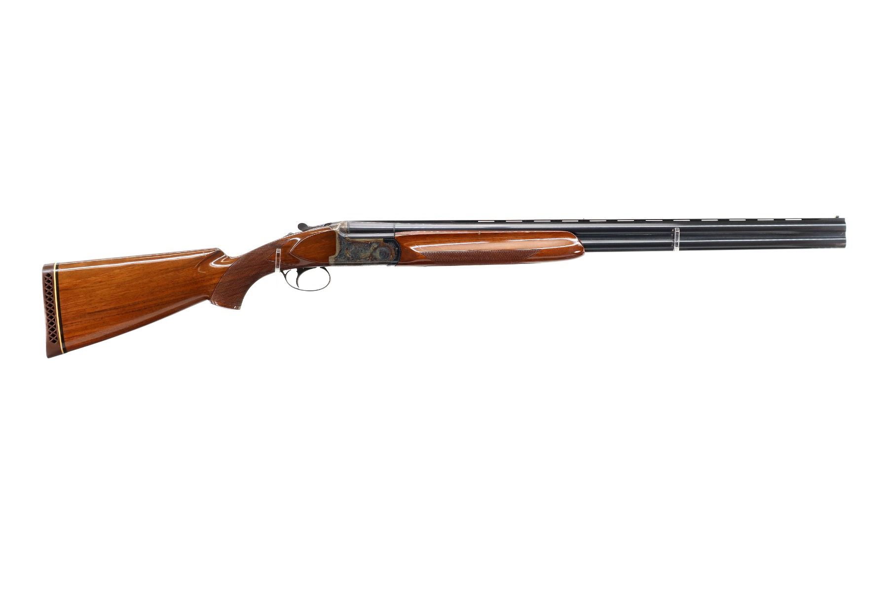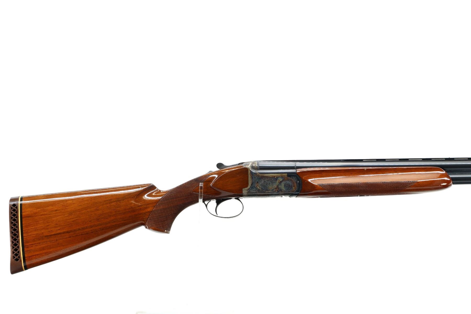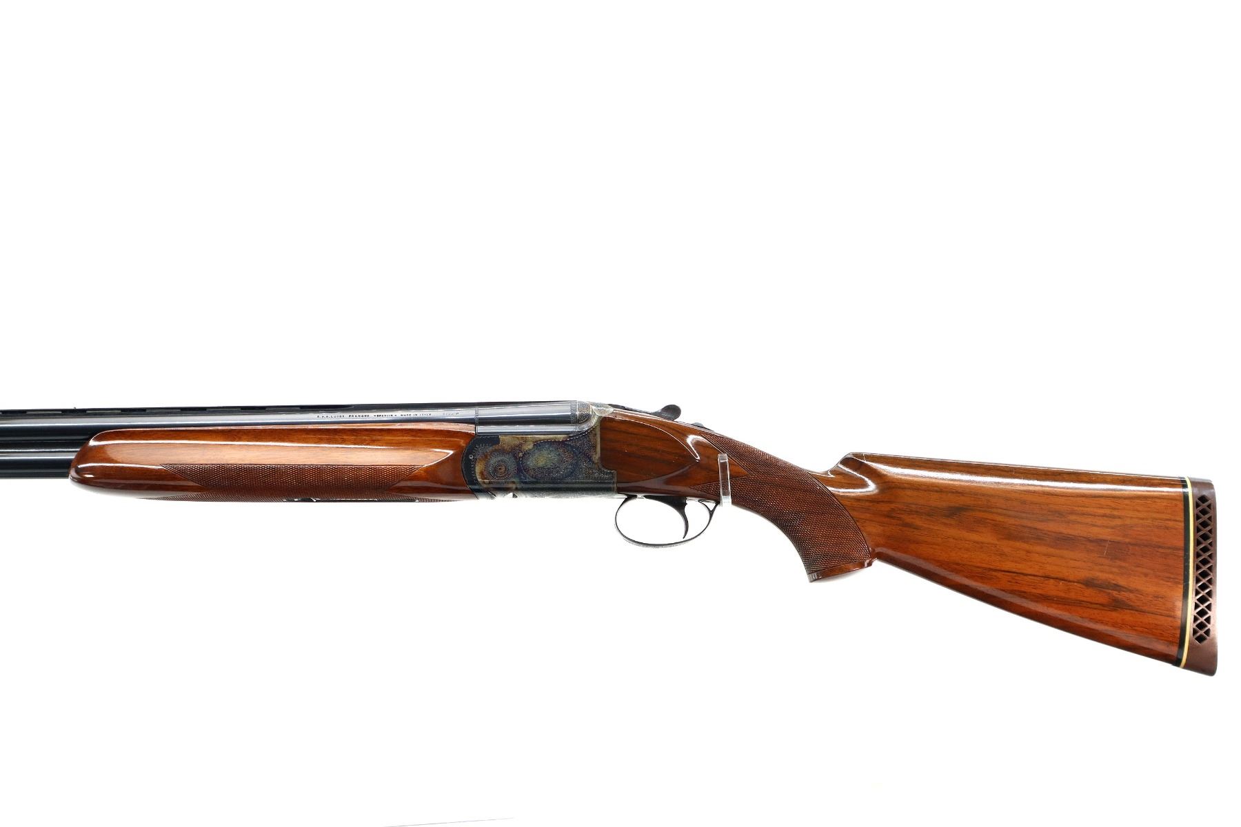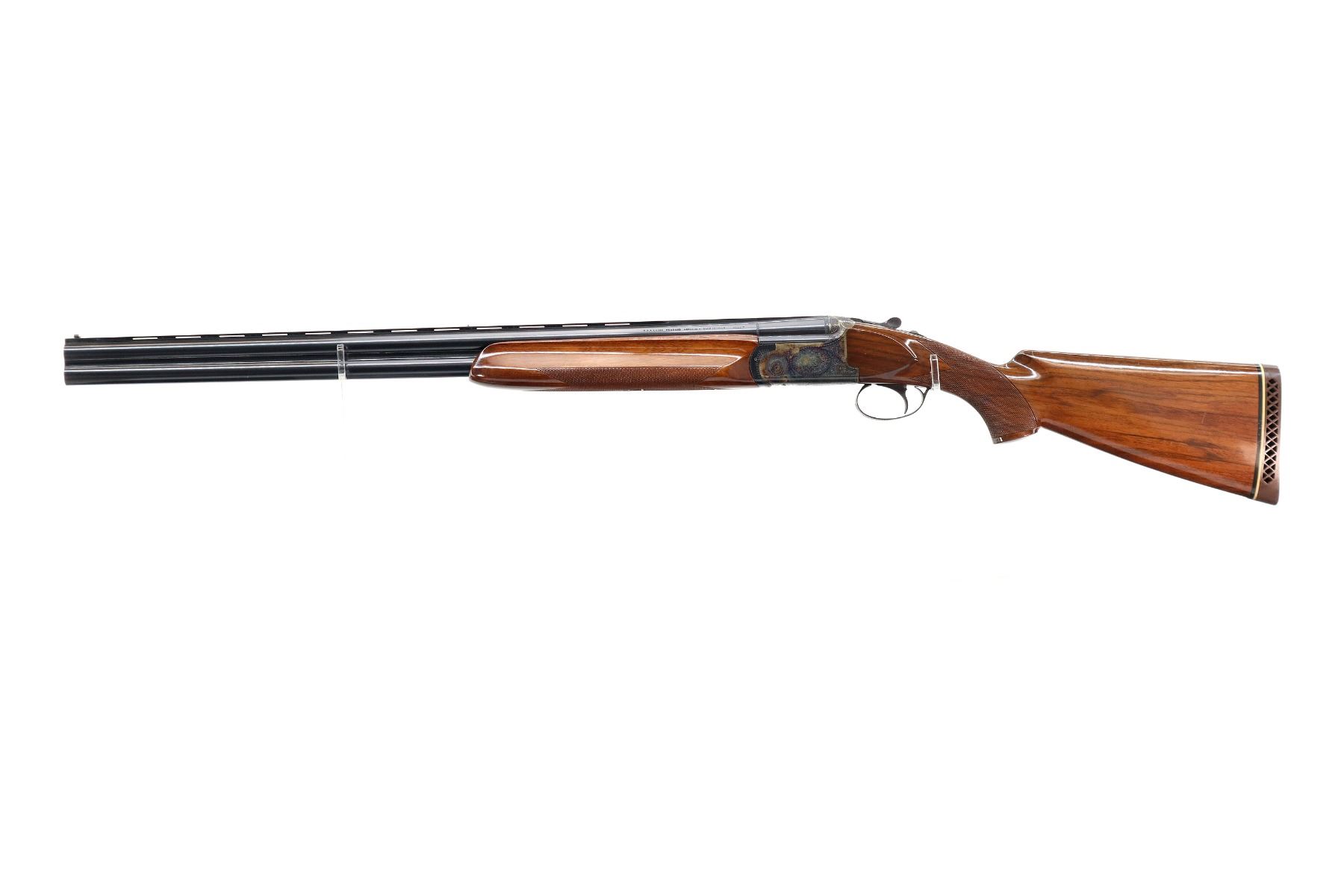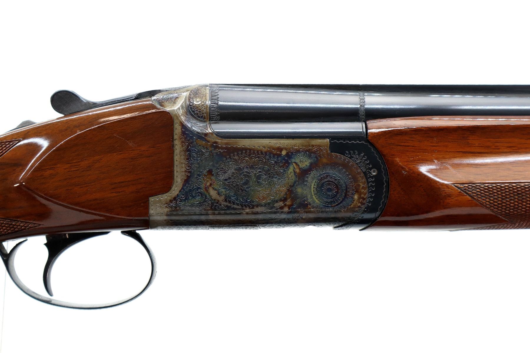Main Description: White front and silver mid rib beads, blued vent rib barrels, engraved colour case hardened receiver, manual selective safety, ejectors, single inertia trigger. Two piece wood stocks, finger grooved checkered forearm note: forearm latch assembly is cracked, loose, requires repair. Checkered pistol grip, brown vented rubber recoil pad