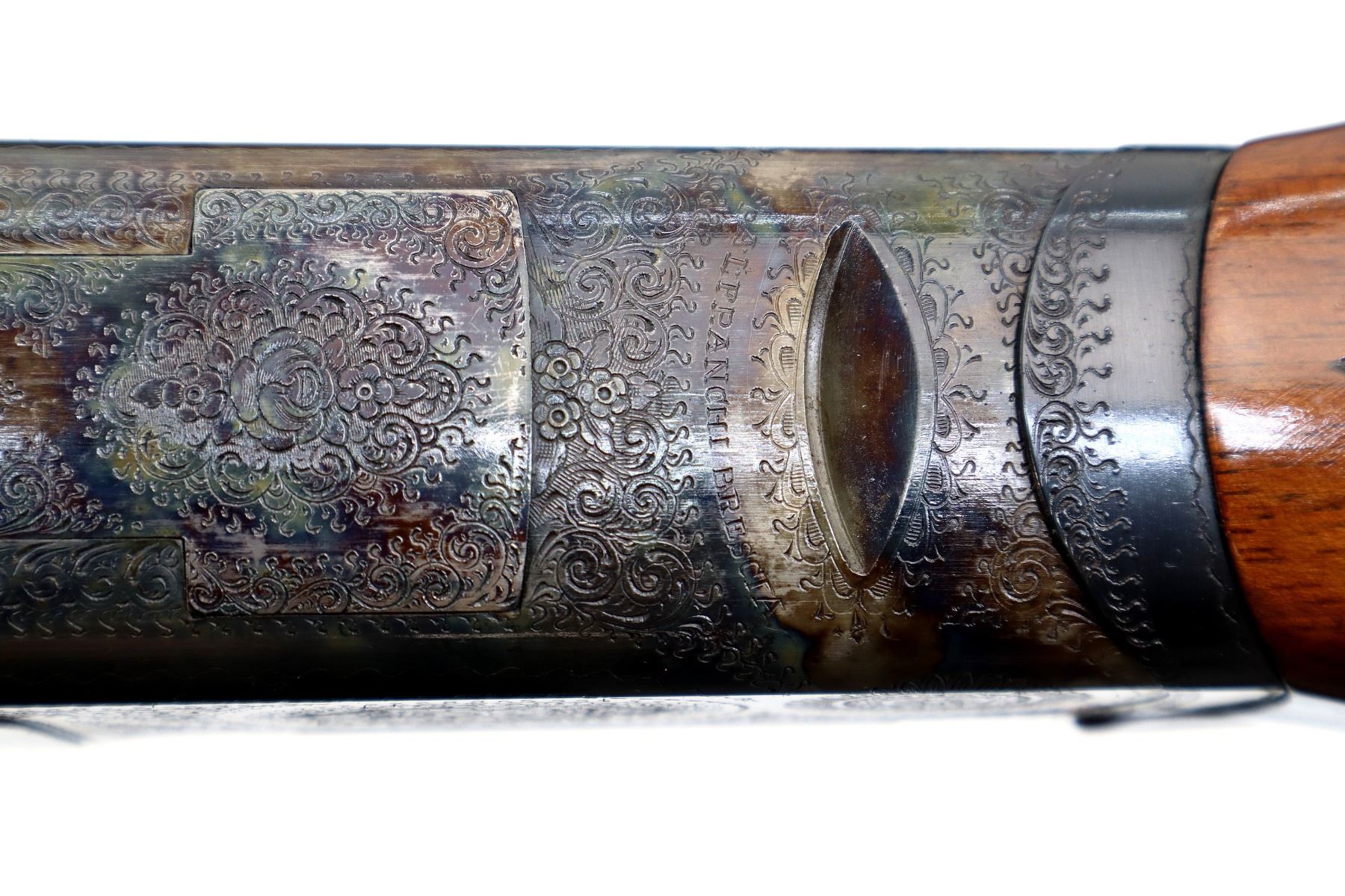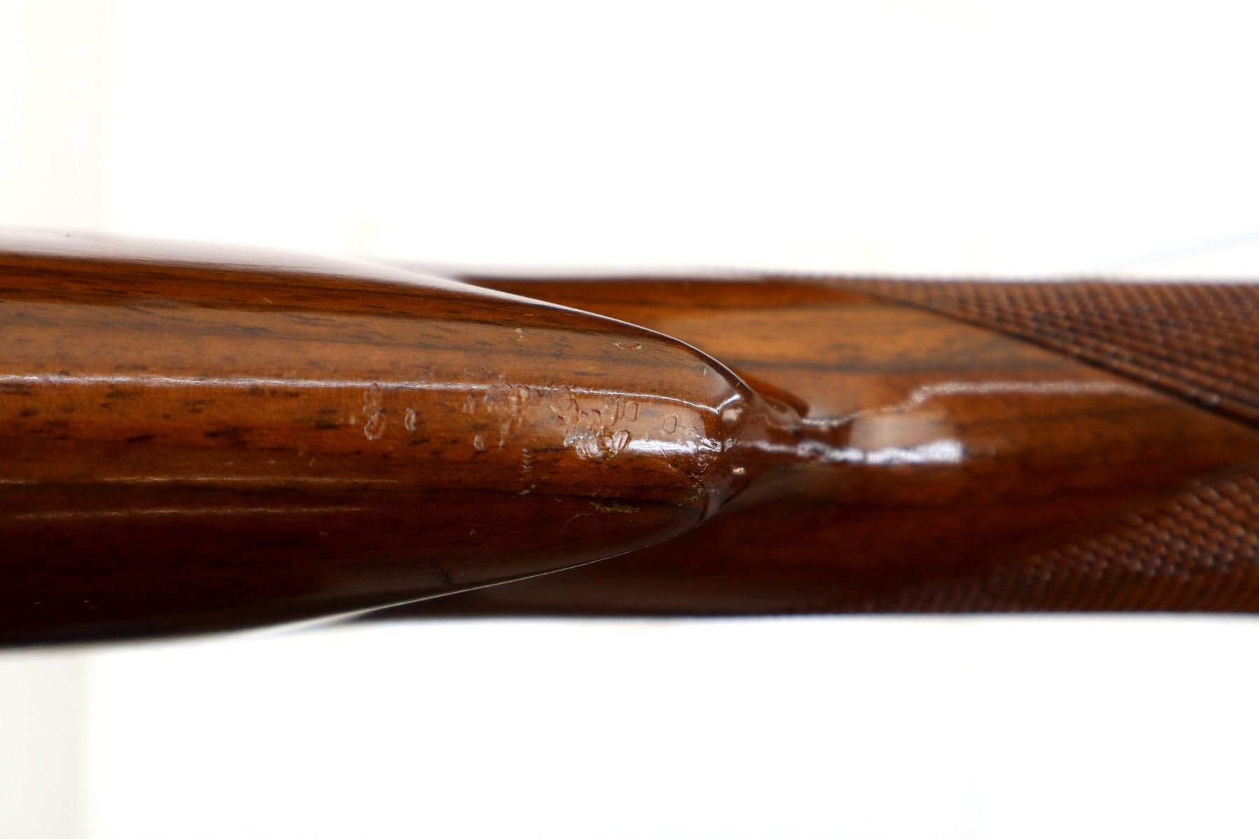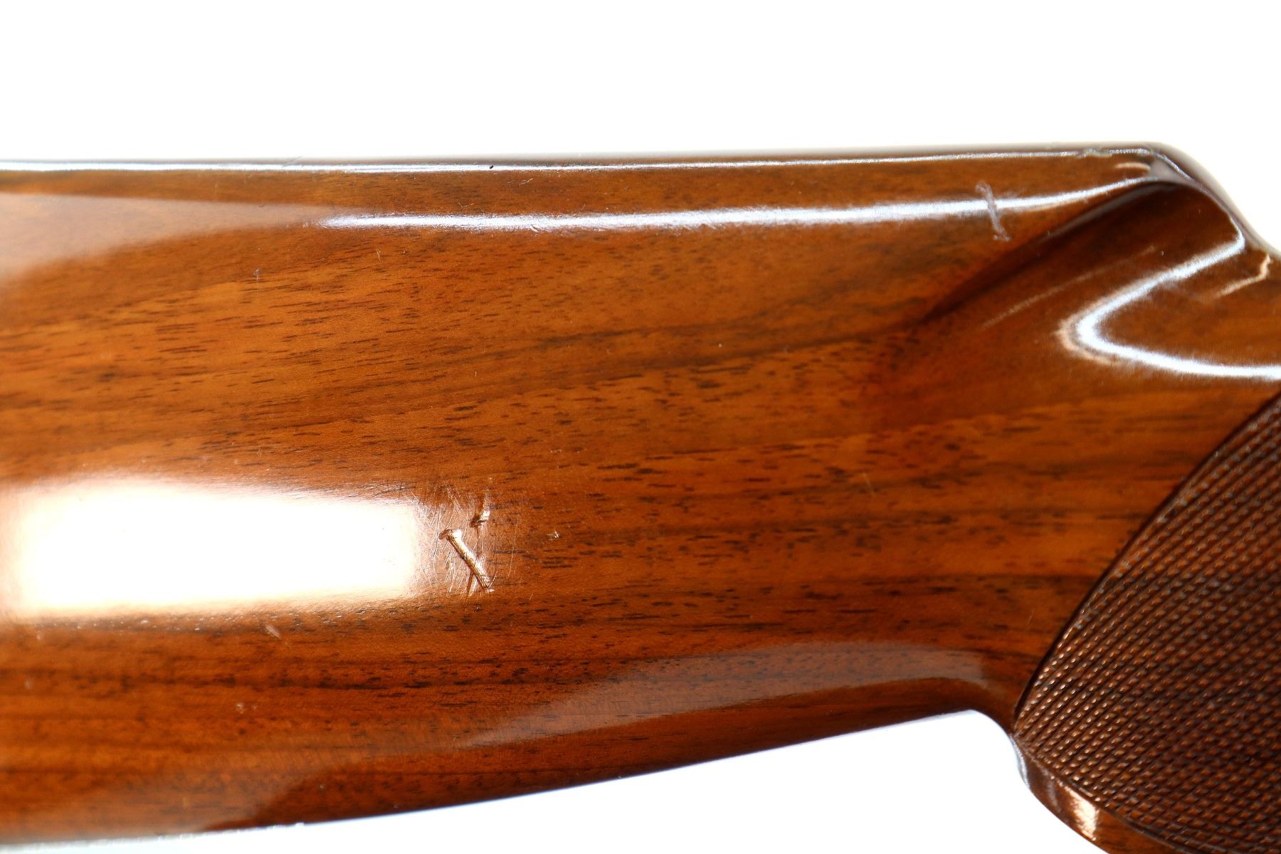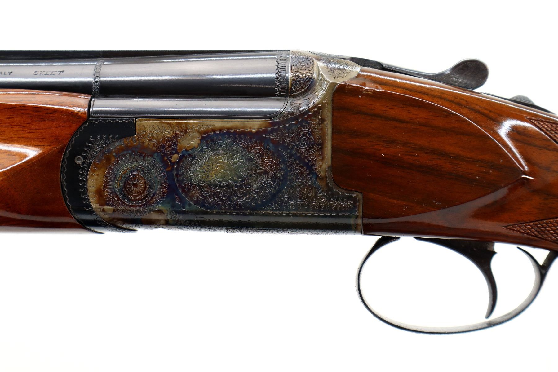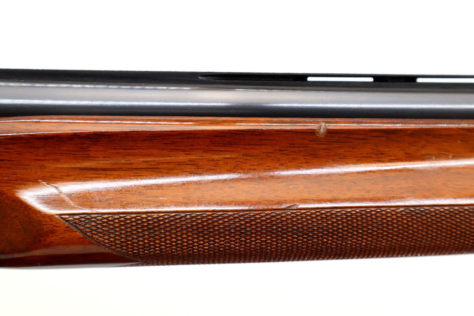 Main Description: White front and silver mid rib beads, blued vent rib barrels, engraved colour case hardened receiver, manual selective safety, ejectors, single inertia trigger. Two piece wood stocks, finger grooved checkered forearm note: forearm latch assembly is cracked, loose, requires repair. Checkered pistol grip, brown vented rubber recoil pad