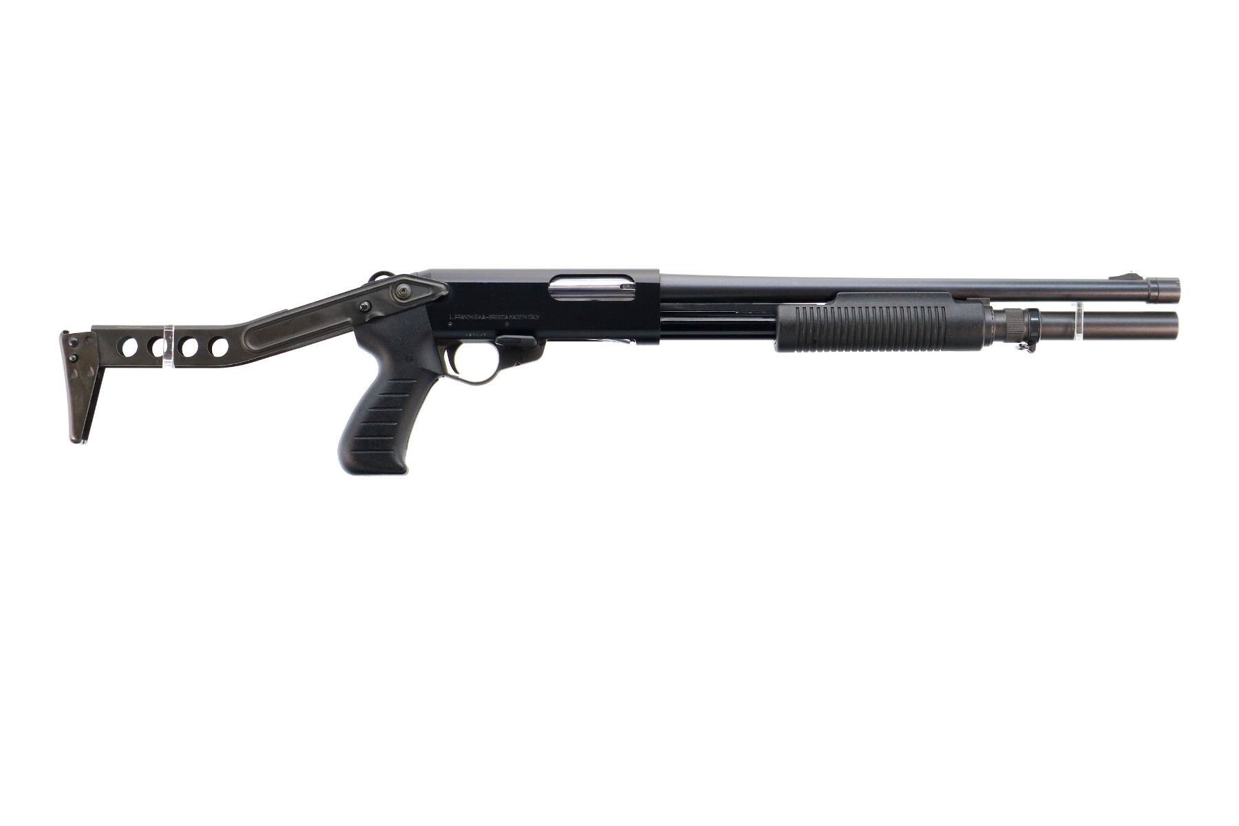 Main Description: Silver bead with ramp, Parkerized round barrel, black alloy receiver. Two piece black synthetic stocks, grooved forearm and pistol grip, attached folding steel butt stock, sling swivels, extended magtube.