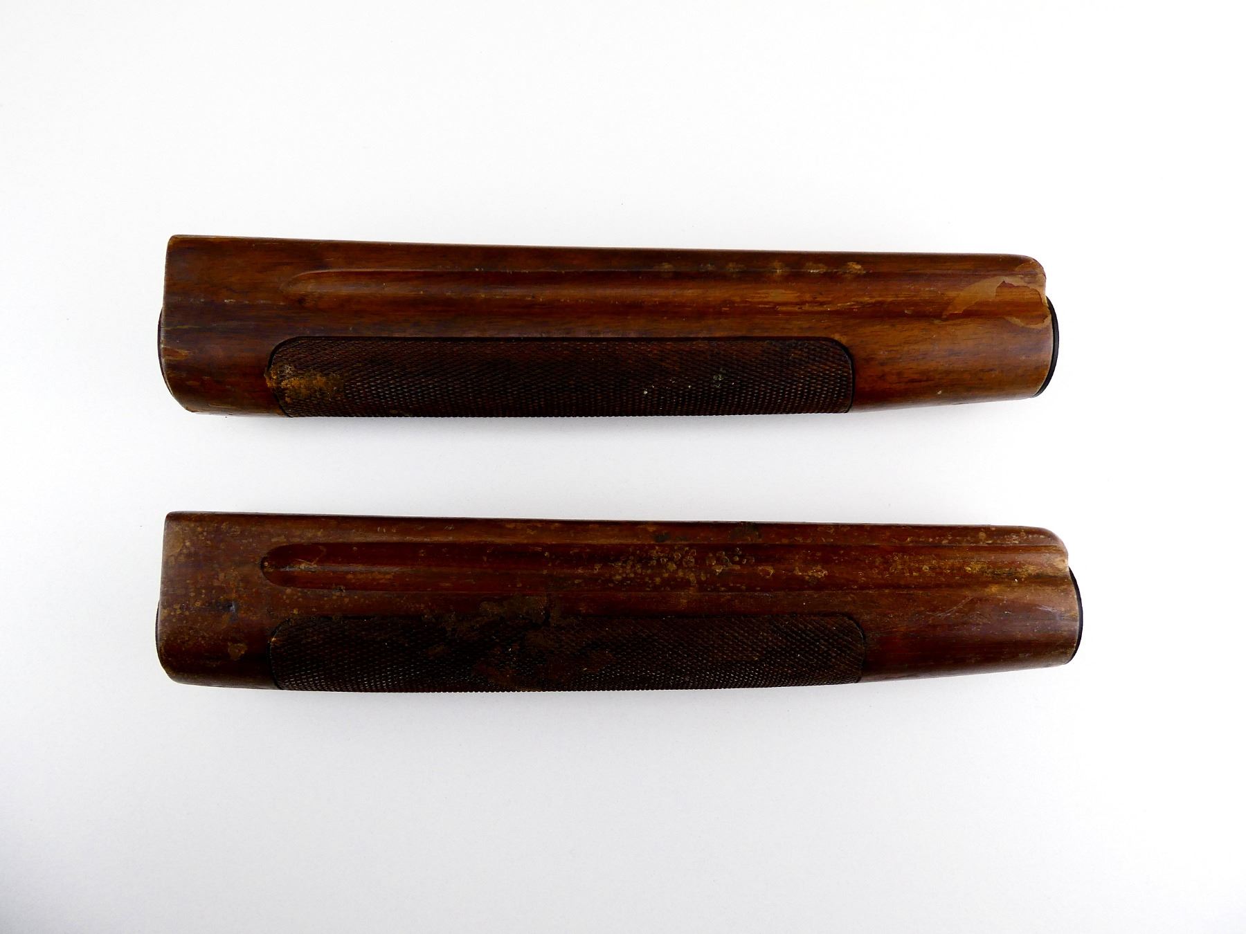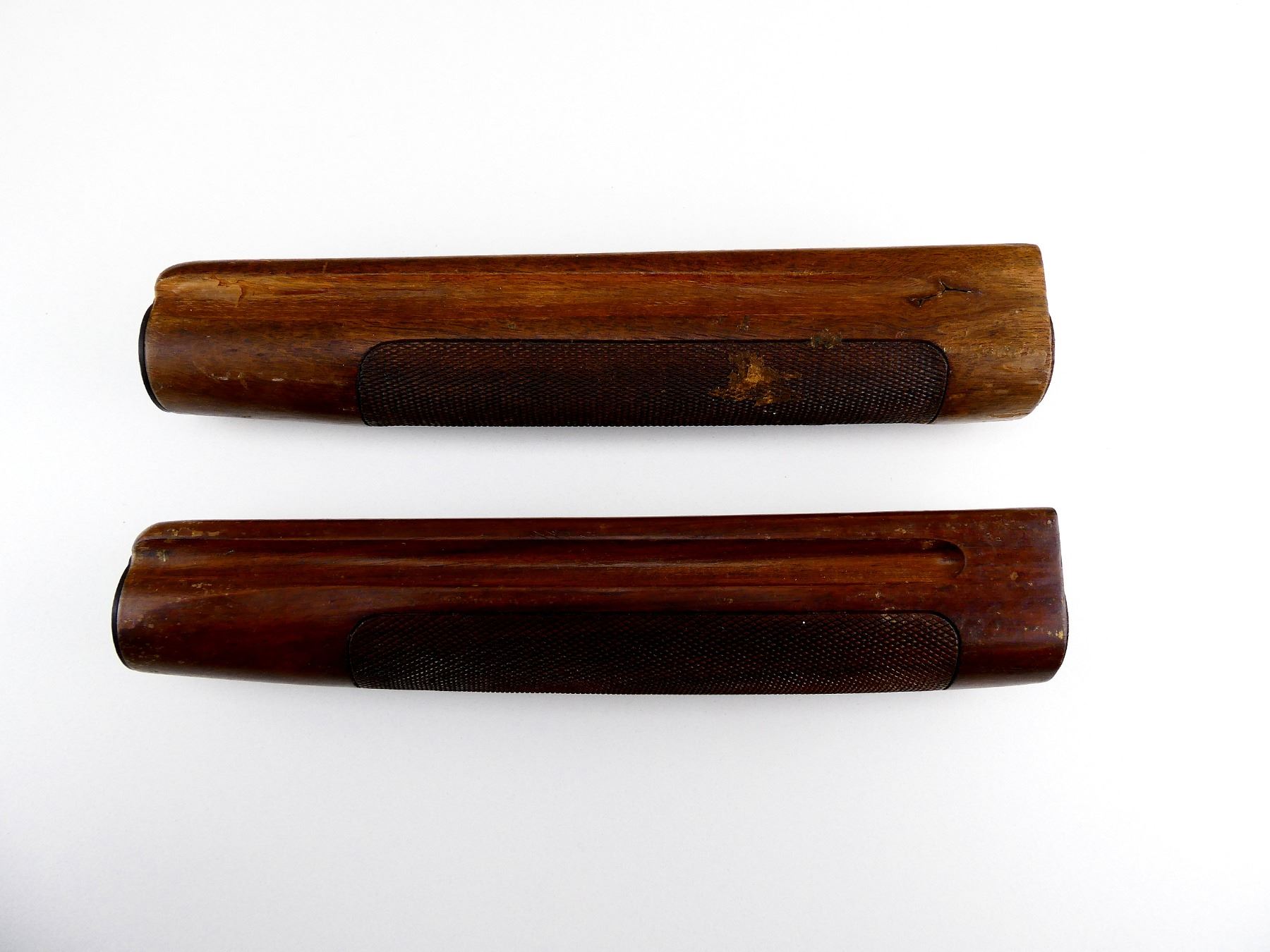 LOT INCLUDES; (2) WOODEN FORENDS, CHECKERED, POSSIBLY FITS 12 GAUGE ?, MAY HAVE SMALL CRACKS & CHIPS, OAL APPROX. 11.25". MAY REQUIRE FITTING. SEE PHOTOS.