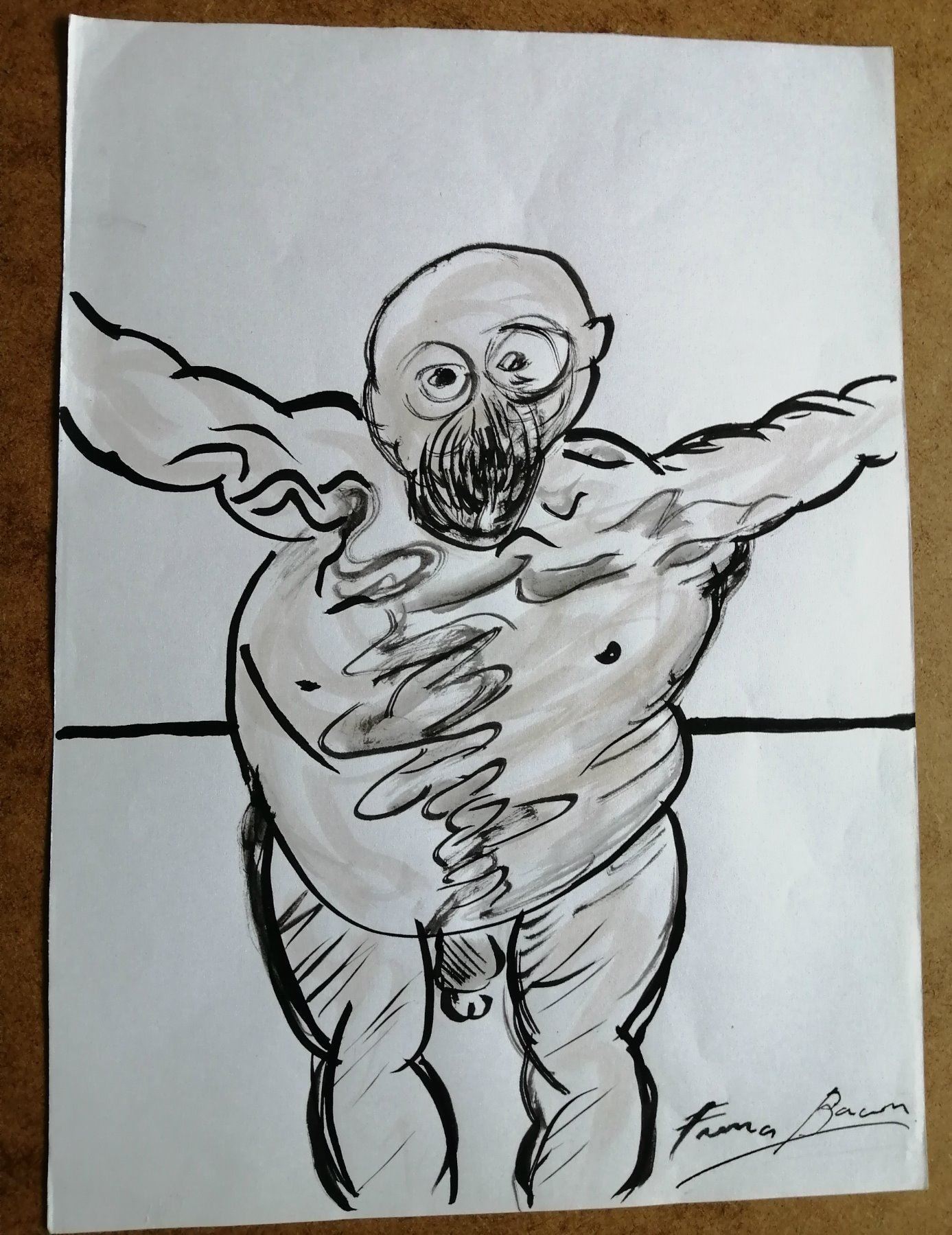A drawing by Francis Bacon of a large nude man. Signed. The paper measures 11.5x8 inches. It's mounted, framed and supplied with coa.