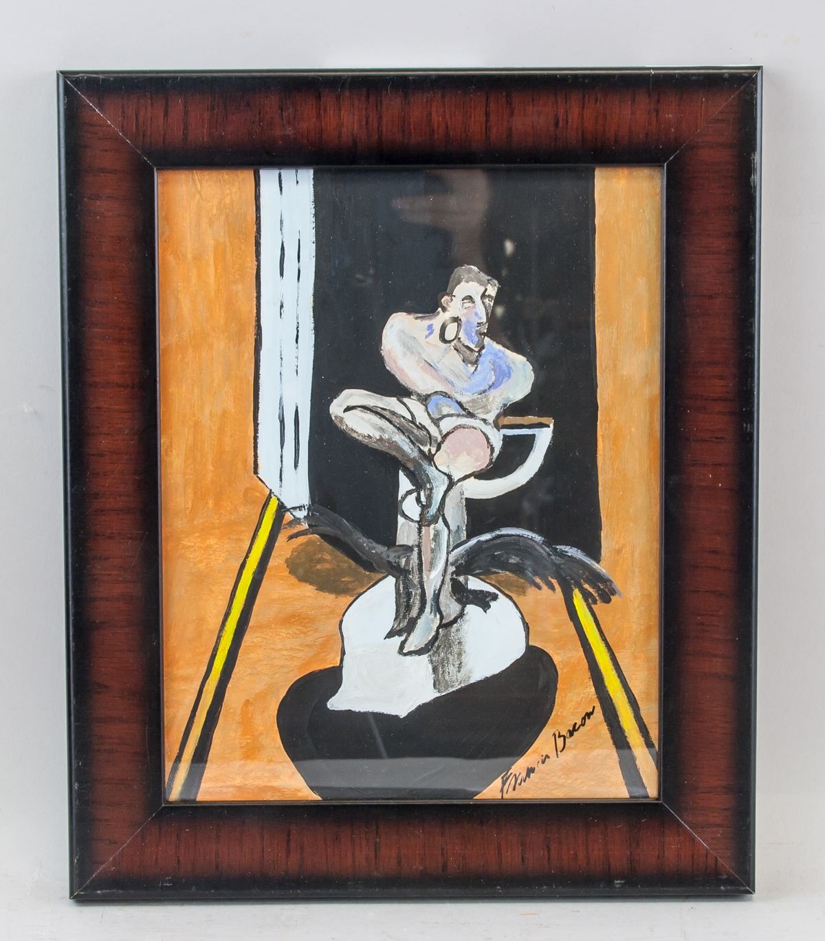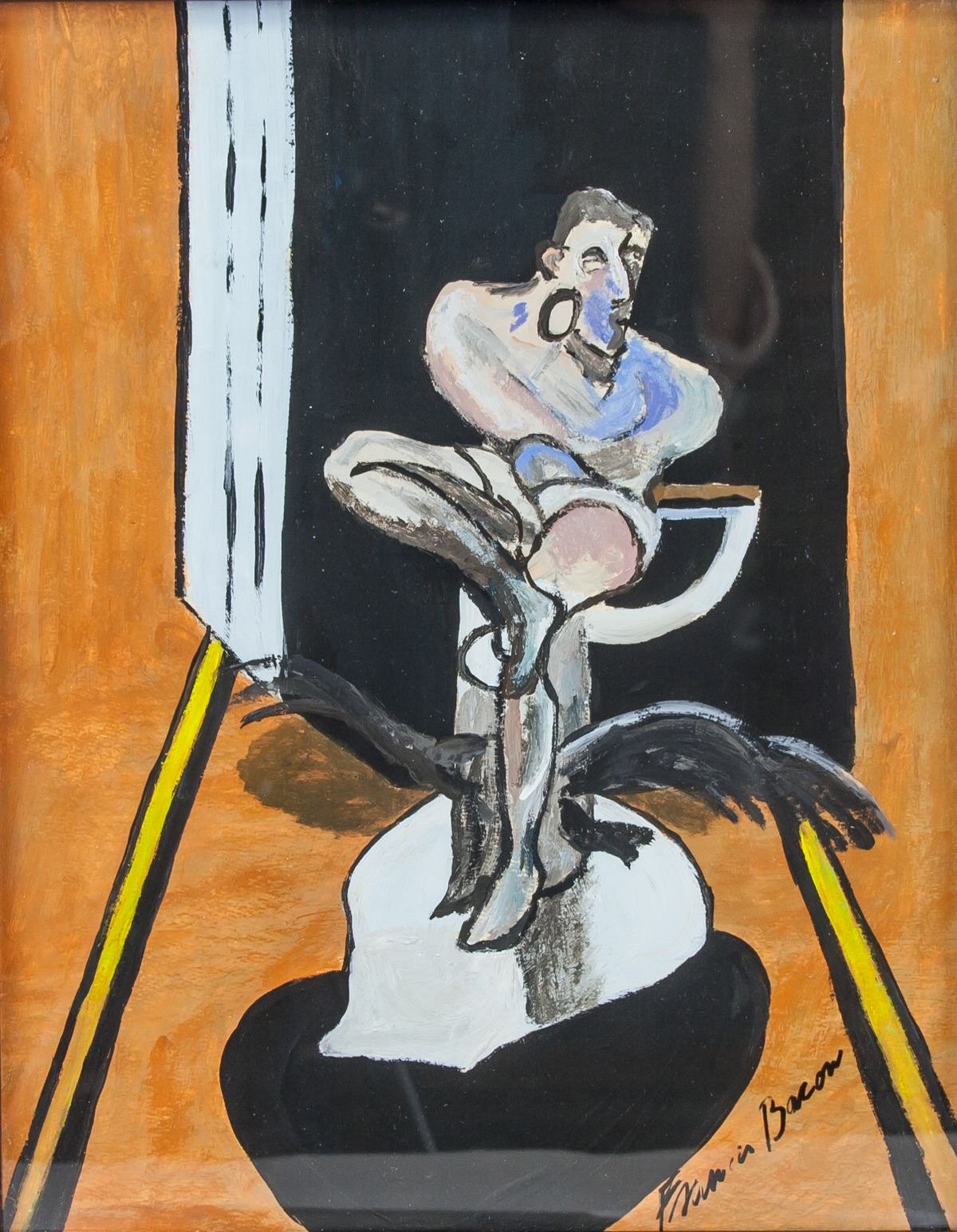 Oil on canvas, framed. Featuring an abstract surreal rendering of a figure. Signed and attr. Francis Bacon (British, 1909-1992) on the lower right corner. 24 x 19 cm (9.4 x 7.5 in). Francis Bacon was a dominant figure of postwar art, and his canvases remain unmistakable for their contorted emotion and visceral physicality. “I would like my pictures to look as if a human being had passed between them, like a snail leaving its trail of the human presence... as a snail leaves its slime,” he once said. Among his signature motifs were screaming and disfigured heads, grappling homosexual lovers, and flanks of meat, and his style is characterized by its flat backgrounds and sense of motion, derived from the frequent use of photography and film stills as sources for portraiture. Mostly self-taught, Bacon nonetheless drew influence from an impossibly wide range of artists, from Vincent van Gogh, Eadweard Muybridge, and filmmaker Sergei Eisenstein, to Rembrandt, Masaccio, Titian, and especially Diego Velazquez, making explicit visual references to many of their works in his paintings. His lasting influence can be seen in particular among Young British Artists such as Damien Hirst, Jenny Saville, and Jake and Dinos Chapman. PROVENANCE: Southern Ontario estate