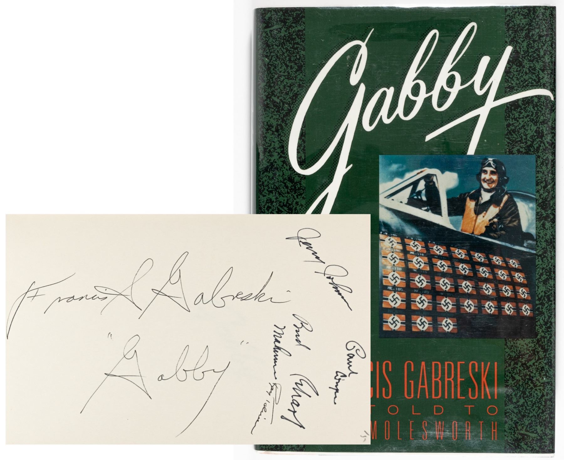 (1919-2002) career pilot in the US Air Force and was the top American fighter ace in Europe during WWII. 'Gabby: A Fighter Pilot's Life'. Written by Francis Gabreski and Carl Molesworth, Orion Books, 1991, 277 pages, hardback, signed on flyleaf, 9.5 x 6.5 inches. 'Francis 'Gabby' Gabreski - Gerald W. Johnson - Paul Cougen - Bud Mahurin - Ray Toliver'. One other unidentified signature.