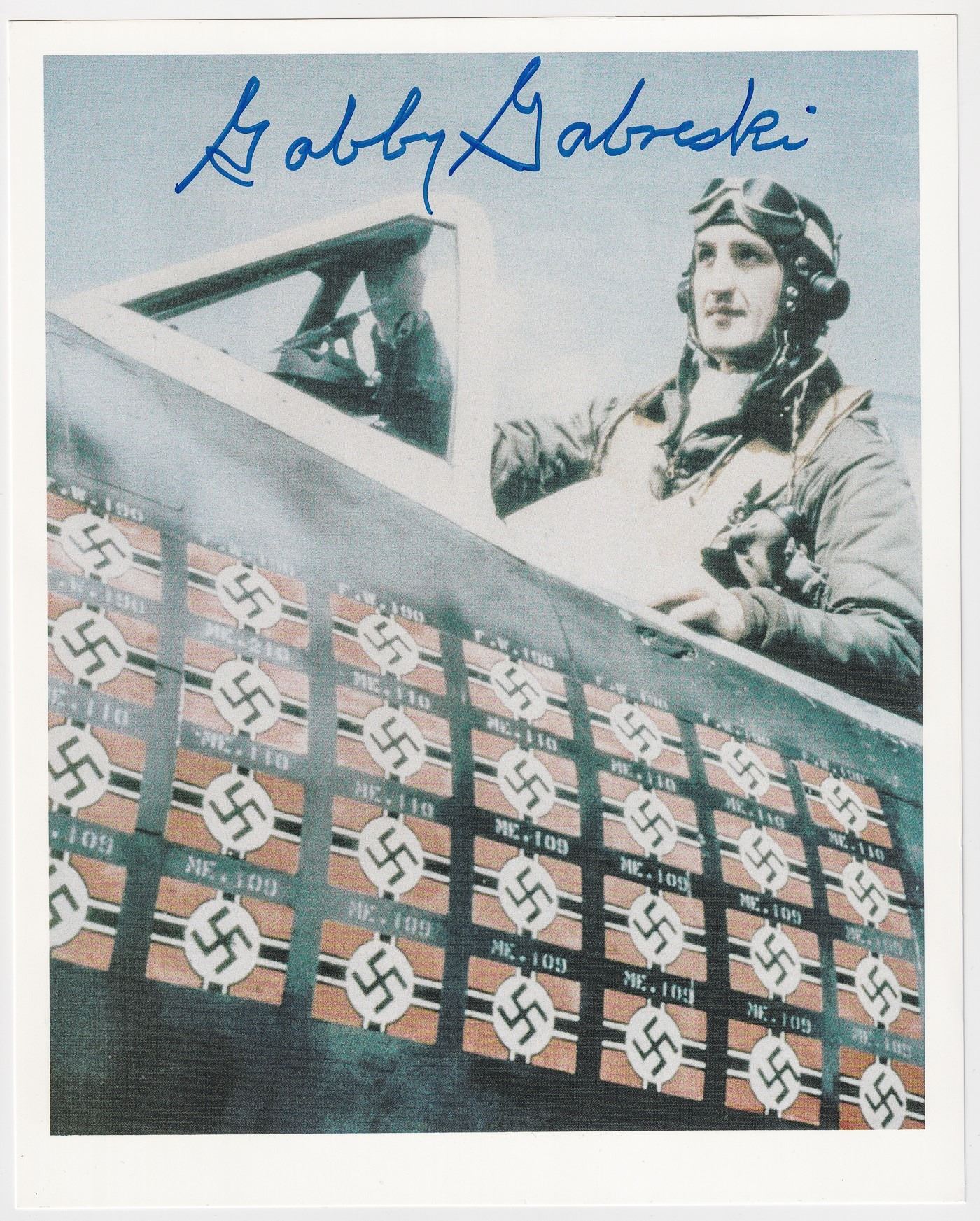 (1919-2002) Top American fighter ace (34 1/2 kills) over Europe during World War II and a jet fighter ace with the Air Force in the Korean War. Signed photograph of Gabreski in the cockpit of his P-47 on July 1944 showing the 28 victory markings. Full signature in blue ink at the top, 8 x 10 inches. Very good.
