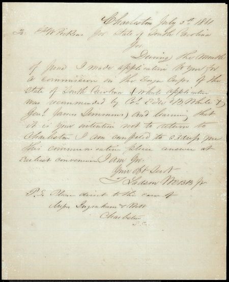 War-date A.E.S. on the verso of a letter sent to him by T. Ladson Webb. Jr., 1p. 4to., Charleston, July 5, 1861, reading in part: "...During the month of June I made application to you for a commission in the Engr. Corps of the State of South Carolina...". On verso Pickens dockets the letter: "The Confederate Govt. have taken charge of Engineer department appointed Major Tiffin[?] chief of the Corps with authority to appoint applicant - apply to him. F.W.P." Light toning, else very good.