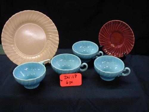 FRANCISCAN CORONADO INCLUDES (1) 8 1/8in PEACH PLATE UNGLAZED (W/ BACK CHIP), (1) GLAZED MAROON SAUCER, (4) GLAZED BLUE CUPS, 6 PCS