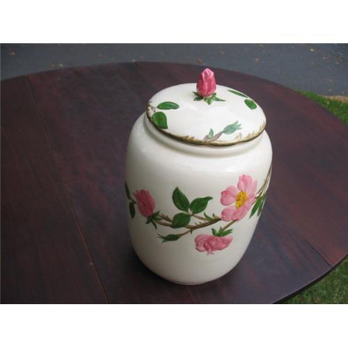 HERE IS A FRANCICAN WARE "DESERT ROSE" PATTERN COOKIE JAR IN GREAT CONDITION WITH THE OLDER FRANCISCAN WARE MARK (1953-1958). IT MEASURES 10.5" TALL TO THE FINIAL OR 8.5" WITHOUT THE LID.