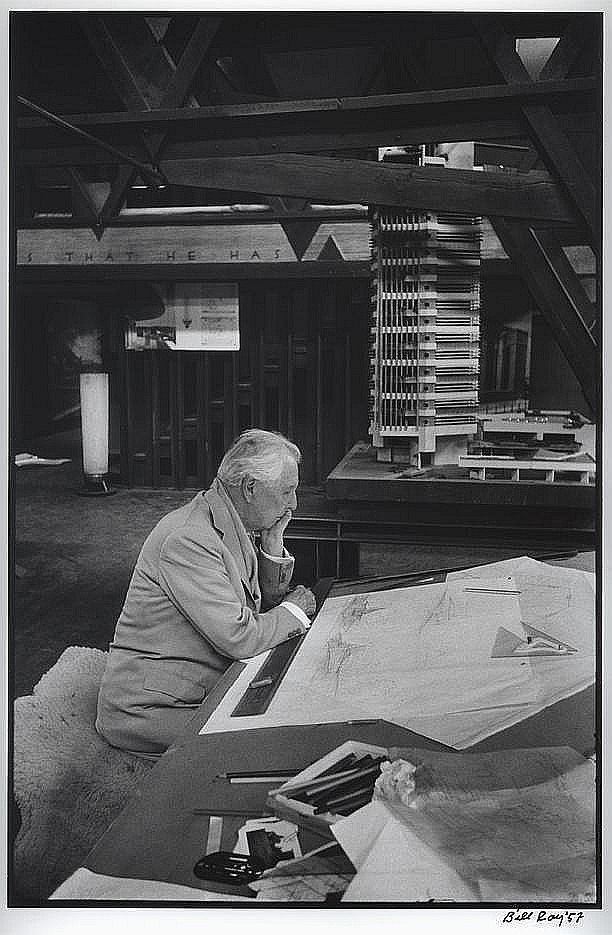 FRANK LLOYD 3/4 UP CLOSE. WRIGHT AT TALIESIN EAST WISCONSIN UP CLOSE 1957 BILL RAY SIGNED SILVER GELATIN.Frank Lloyd Wright in the drafting room at Taliesin, Spring Green, 1957 upclose. Frank Lloyd Wright was an American architect, interior designer, writer, and educator, who designed more than 1,000 structures, 532 of which were completed. Wright believed in designing structures that were in harmony with humanity and its environment, a philosophy he called organic architecture. This silver gelatin later print measures 11x14 inches and is signed by Bill Ray. Condition Report: Finest quality: Museum/Gallery quality standard. Provenance: Obtained directly from Bill Ray