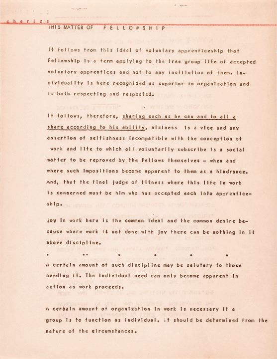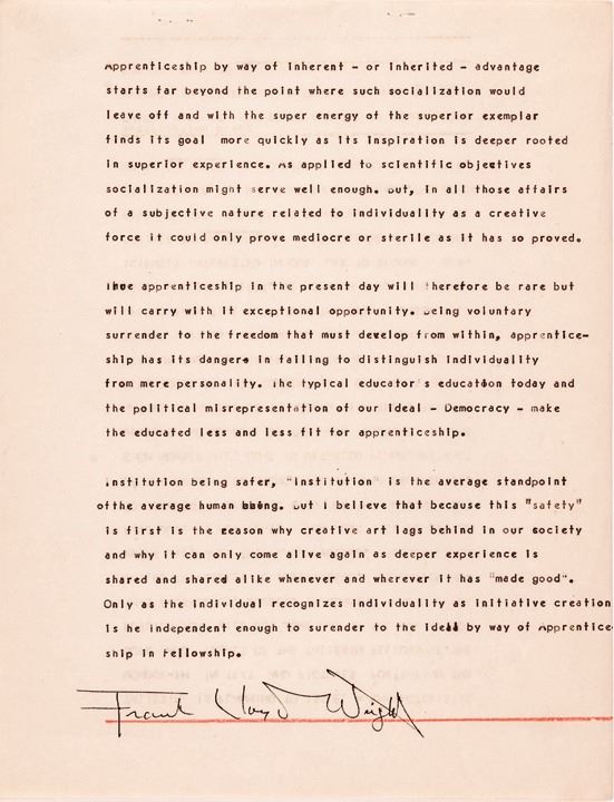 c. 1933/1934, Archive Lot of Four Items including, "The Matter of Fellowship" Typed Manuscript Signed, "Frank Lloyd Wright" in black ink upon page 3, measuring 8.5" x 11", 3 pages (recto only), Choice Extremely Fine. This is Addressed to Charles Edmons. In his long typed essay, Frank Lloyd Wright expounds on his theory of what his Fellowship should strive for on both philosophical practical levels, and social levels. Here Wright’s extensive Manuscript reads, in part: