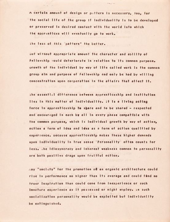 Wright established the “Fellowship” to give practical on the job training to future draftsmen and architects. However, he often used the men as laborers to work his farm or to repair and maintain his properties. In later years these men were used as a source of free labor on his many architectural projects. *See: Roger Friedland and Harold Zellman's book, "The Fellowship," 2006, for all the intimate details and history of Wright and his “Fellowship”.