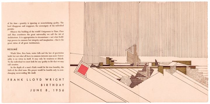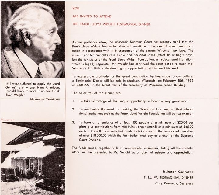 Besides the Frank Lloyd Wright Signed Manuscript, this Lot also includes a tri-fold Brochure dated June 8, 1956, commemorating Wright's birthday, 5.5" x 8.5" folded size; another folded Invitation to Taliesin and dated, "To Friends 1948-1949” 6.25" x 9" folded size; and finally a two-page Invitation to the "The Frank Lloyd Wright Testimonial Dinner" on February 10, 1955. A wonderful, rare historic Set of Documents from America's Foremost Architect. (4 items)