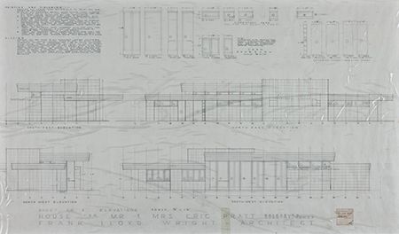 (1867-1959) American architect, one of the most influential of all time, he was the creator of so-called organic architecture utilizing novel shapes and incorporating his buildings into their settings. A superb, architecturally important piece, being an original signed hand-drawn architectural drawing (not confirmed but possibly drawn by Wright himself) measuring 34" x 20" (sight), and showing three elevations for a house designed drawn by Wright, this plan is titled "Sheet No. 3 House for Mr. & Mrs. Eric Pratt Galesburg Country Homes". Finely drawn in pencil with red details, it is signed at bottom right by Wright: "F LL Wr Mar. 20 49". In 1936, Wright developed a series of cost-controlled homes dubbed "Usonian". Prompted by the economic depression of the time and modeled on his earlier Prairie Style, the Usonians were designed simply, and without an attic or basement. The one-story domiciles were modularly constructed with concrete blocks and designed to be configured in a number of ways. The Eric Pratt House was an example of this design aesthetic, which Wright later referred to "Usonian Automatic". Located near Kalamazoo, MI, it was completed in 1951, and is considered a fine example of the form. Matted and set into a wood frame that shows some damage. Fine condition, not examined out of frame, certainly worthy of re-framing.