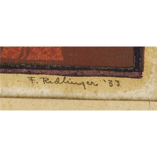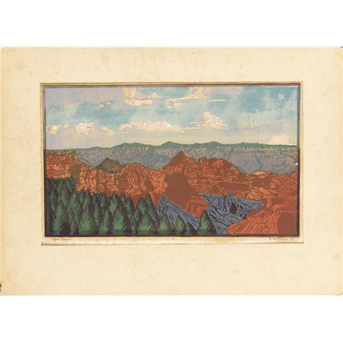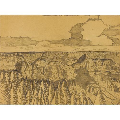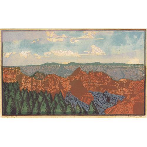 <B>FRANK REDLINGER (1909-1936)</B></I><BR><I>Grand Canyon,</B></I> 1933<BR>Color-block print<BR>8 3/4in. x 14 1/4in.<BR>Signed and dated lower right<BR>Titled lower left<BR><BR>A tour-de-force in color-block printing, this work shows Frank Redlinger at his best. Multiple blocks and impressions (one for each color) were required to complete this print. It is evident Redlinger made adjustments in the final composition, both widening the print and recomposing the clouds.<BR><BR>The preparatory pencil drawing from which the block print was made is included with this lot. <BR><BR>Provenance:<BR>Estate of Frank Redlinger<BR><BR> <B>Condition Report:</B> Print: Excellent condition with some foxing, mainly in the margins. Unframed. Drawing: Excellent condition with minor damage to bottom left corner. Unframed<BR><BR><b>Shipping:</b> Requires 3rd Party Shipping (<a target="_blank" href="http://www.heritageauctions.com/common/shipping.php">view shipping information</a>)