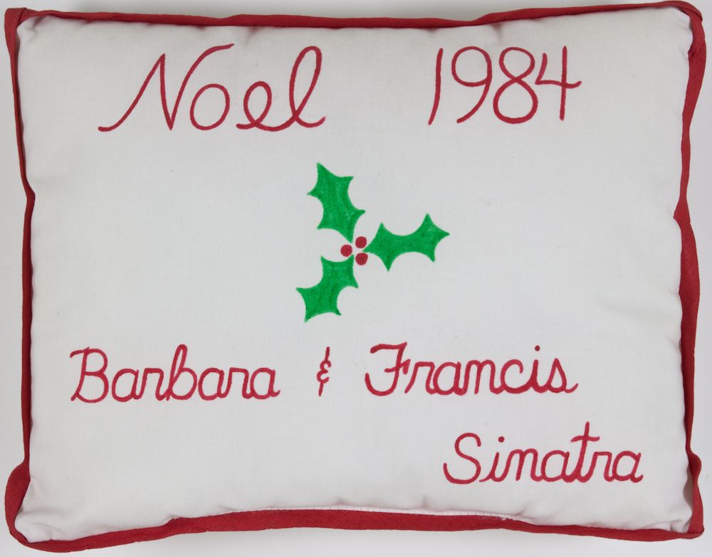 A great Sinatra relic, a 9 1/2" x 7" white pillow with red trim, bearing red hand-printed lettering: "Noel 1984 Barbara & Francis Sinatra". At center appears a small sprig of holly with three red berries. Fine condition. In 1984 the Sinatra's commissioned Bloomingdales to prepare these pillows individually to be sent to their many friends - this example was sent to Sinatra's highly valued dentist!