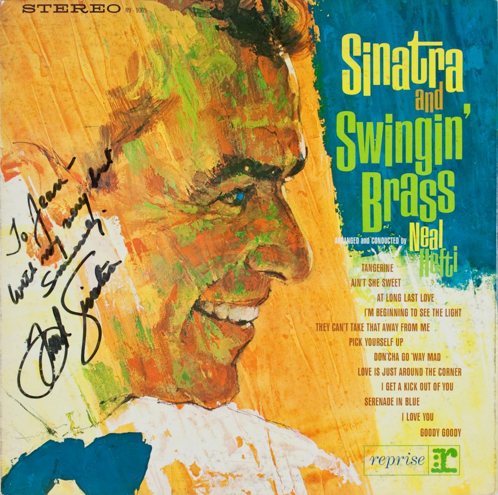 (1915-1998) American singer and actor and a widely-popular sensation during his entire fifty year career. Signed album "Sinatra and Swingin' Brass", arranged and conducted by Neal Hefti, Reprise, 1961, boldly and flamboyantly inscribed and signed on the front cover in black marker. The recipient was the wife of Sinatra's dentist, a man obviously highly prized by the crooner. Slight wear to the signature, else very good.