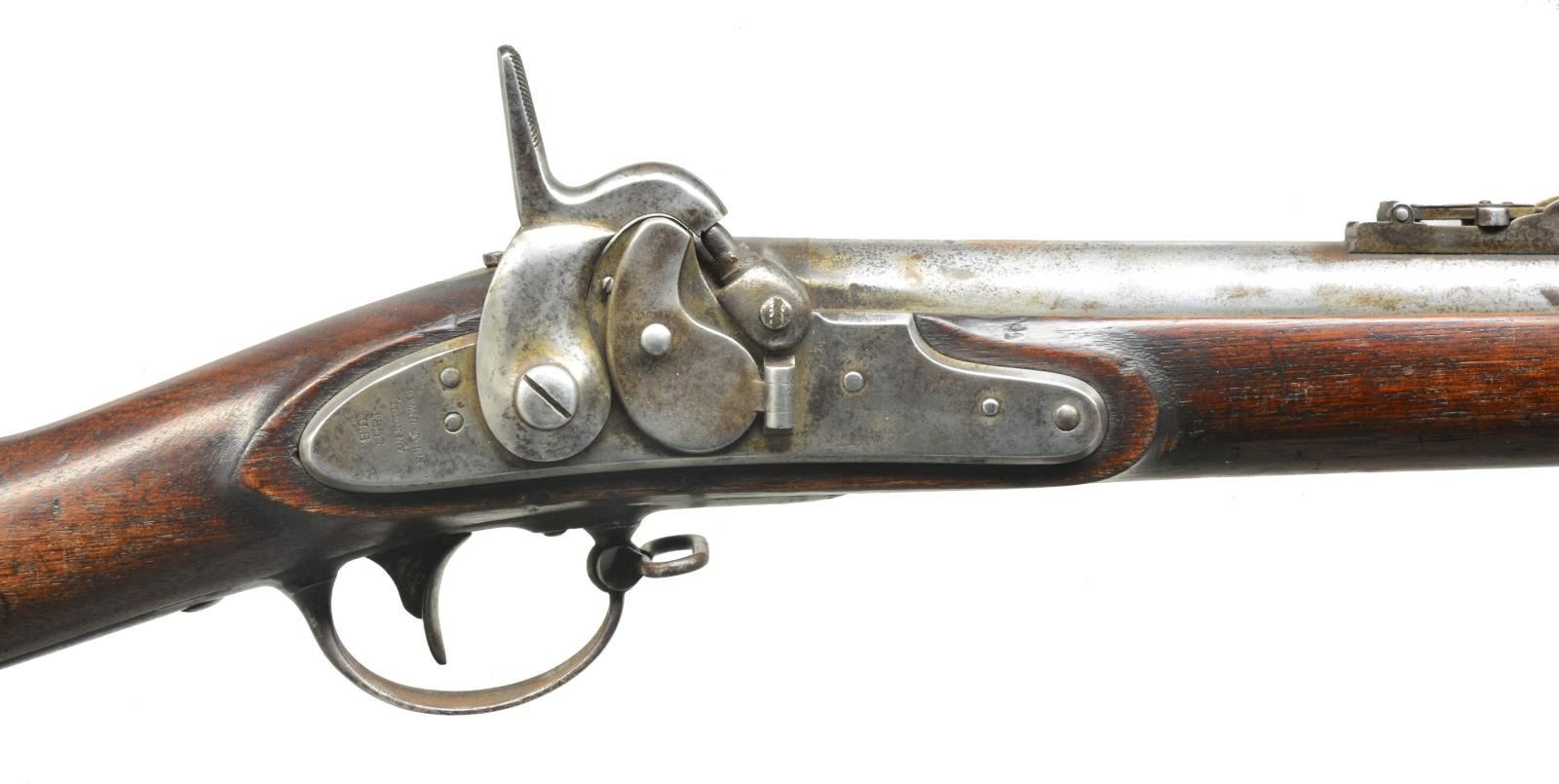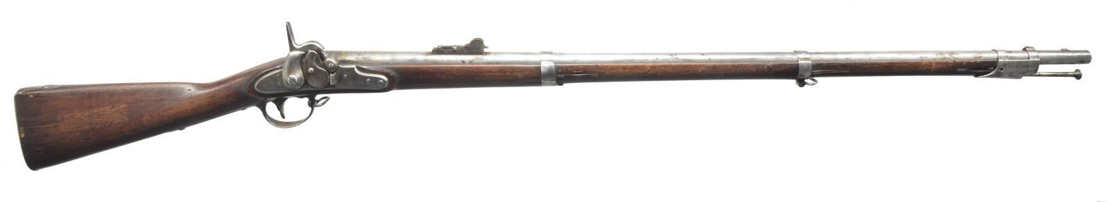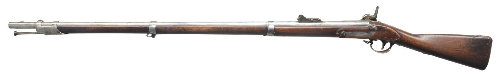 Cal. 69. NSN. Bbl. 42" rifled. Blade front sight w/ graduated leaf rear sight. Remington mfg. lock w/ Maynard tape primer feed mechanism. Bbl. & lock are dated 1857. 3 Band walnut stock w/ iron fittings & iron tipped ramrod. Left ear has 2 lightly visible cartouches. Toeline of stock has "GS" cartouche. Comb of stock near buttplate peak is stamped "V / 7". Remington supplied 20,000 locks to Frankford Arsenal for conversion 1856-1858. CONDITION: metal shows cleaning having a gray appearance w/ scattered pitting. Stock has worn finish showing dents, scratches & marks. Primer mechanism is intact. Bore retains intact rifling showing light pitting. (01-18277/DS). ANTIQUE. $1,000-1,500.
