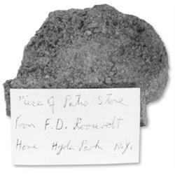 (FRANKLIN D. ROOSEVELT): (1882 - 1945) Thirty-second President of the United States who instituted the "New Deal" programs and who led the United States through most of World War II. Presidential relic from the home of Roosevelt consisting of a piece of patio stone 3 3/4" x 2 3/4" bearing a manuscript tag reading: "Piece of Patio stone from F. D. Roosevelt, home, Hyde Park, N. Y.,". Acquired from the collection of a privately owned New York State museum assembled during the 1930's. Overall very good. Est.: 200-300. $200-300