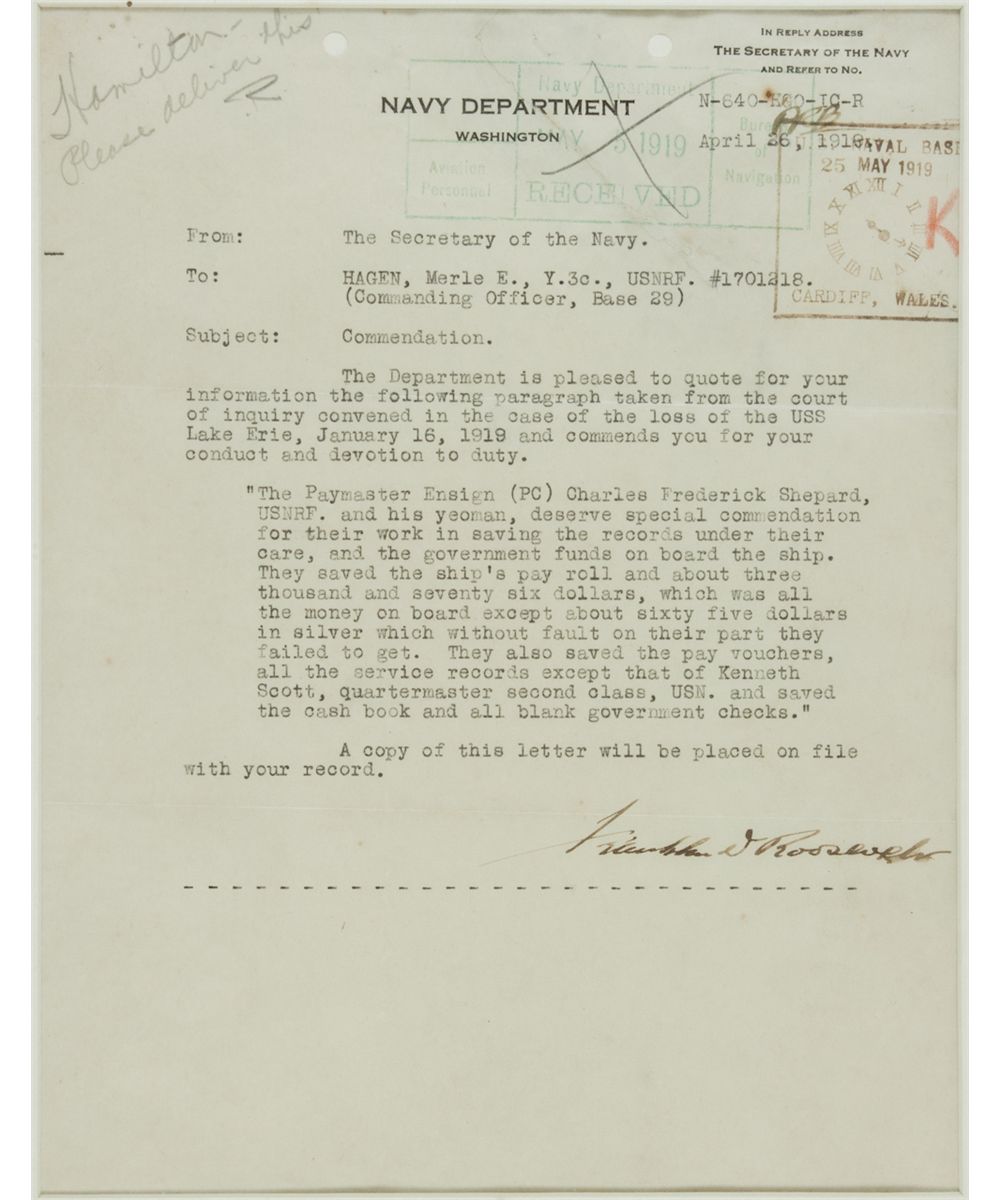 (1882 - 1945) Thirty-second President of the United States who instituted the "New Deal" programs and who led the United States through most of World War II. D.D. as Asst. Secretary of the Navy, 1p. 4to., Washington, Apr. 26, 1919, concerning a commendation to be given to Paymaster Ensign Charles F. Shepard who had served aboard the USS LAKE ERIE when she was accidentally rammed and sunk by the USS HAZEL BRANCH off Wales three months earlier. Roosevelt notes that the court of inquiry had commended Shepard for having had the presence of mind to save the vessel's payroll of $6,076, as well as the pay vouchers, cash book, and blank checks before the vessel went down. Multiple dockets, file holes at top, else very good. Matted with two news clippings, set into a simple frame. Sheppard escaped the vessel just as it capsized...