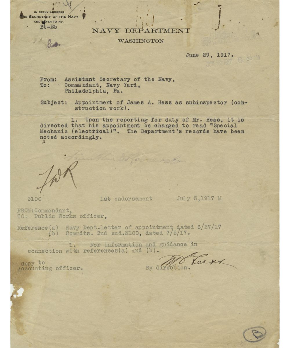 (1882 - 1945) Thirty-second President of the United States who instituted the "New Deal" programs and who led the United States through most of World War II. T.L.S. "FDR" as Assistant Secretary of the Navy, 1p. 4to. on Navy Department letterhead, Washington, June 29, 1917 to the Commandant of the Philadelphia Navy Yard concerning the "Appointment of James A. Hess as subinspector (construction work)… it is directed that his appointment will be changed to read 'Special Mechanic (electrical)…" With typed endorsement below. Marginal wear, minor losses and toned at margins, usual folds, else very good condition overall.