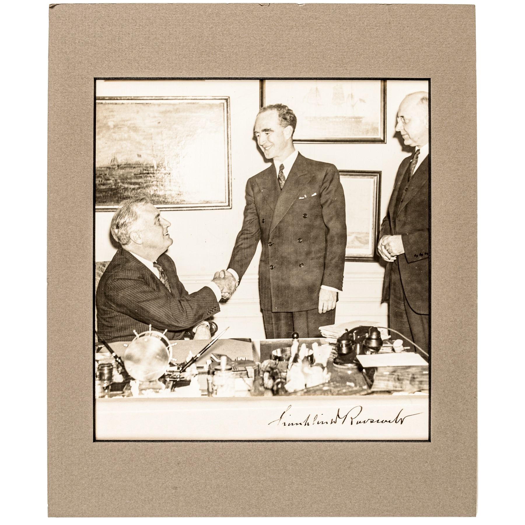 1. Black-and-white Photograph Signed, “Franklin D. Roosevelt” signed on a separate white sheet of paper attached underneath to the glossy photo image of a seated Roosevelt greeting Frank Murphy, the first Governor-General of the Philippine Islands from 1933-1936. This Photograph measures 7.5” x 8”, Choice Extremely Fine. The “Franklin D. Roosevelt” Signature appears to be the bottom part of a letter being extremely sharp and vivid.