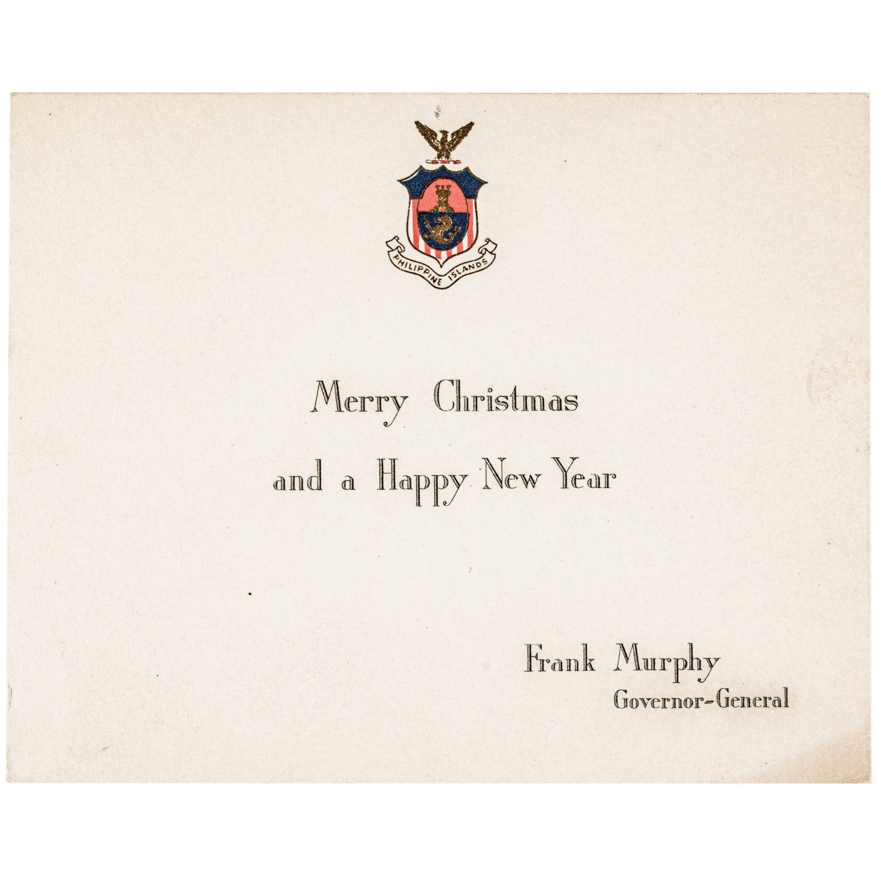 3. Plus, a Christmas Card from Frank Murphy as Governor-General of the Philippine Islands, 4” x 5,” Extremely Fine.