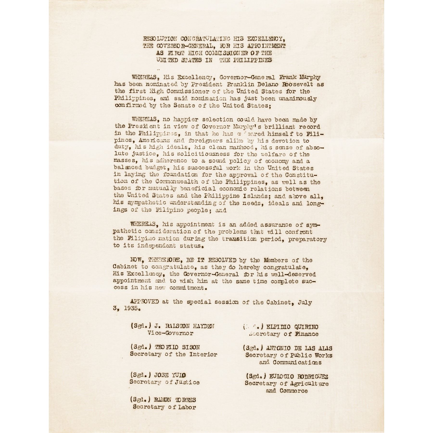 2. Plus, a Mimeograph copy of a Resolution of the Philippine Cabinet congratulation Murphy on his new position, 10.5” x 8,” Extremely Fine. Most likely very rare, as this is from Murphy’s personal archive.