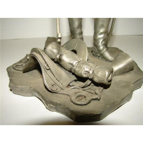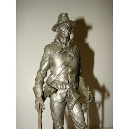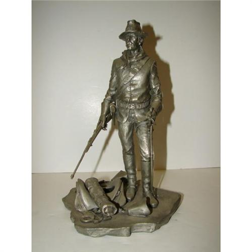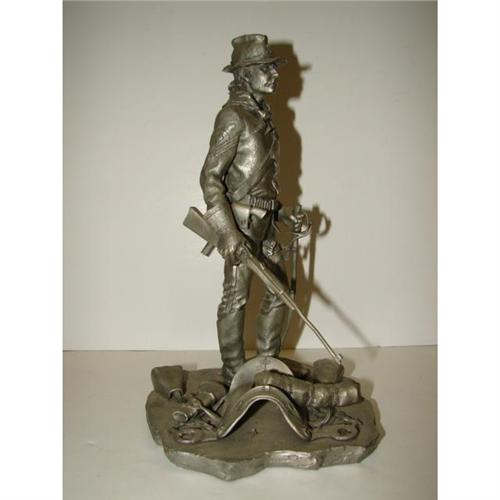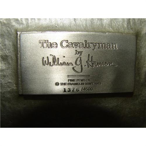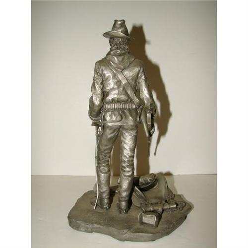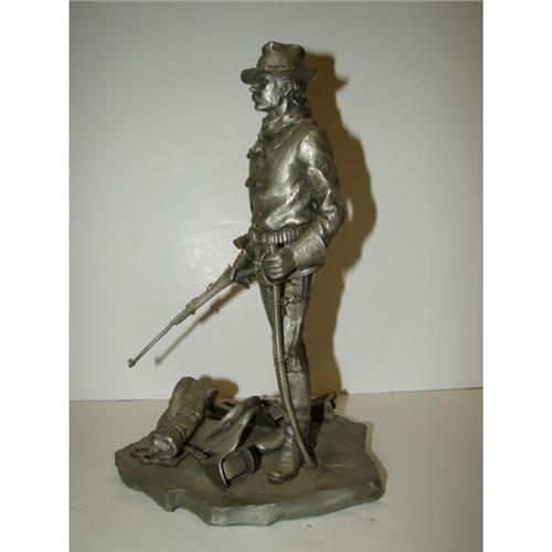 FRANKLIN MINT CAVALRYMAN PEWTER FIGURINE. Depicts a standing U.S. cavalryman from the Indian Wars holding a rifle in his right hand and a sword in his left hand with a saddle on the ground near his feet. Marked on bottom “The Cavalryman/by/William G. Hanson/Fine Pewter/The Franklin Mint 1983/1376/4500”. 10.25” H