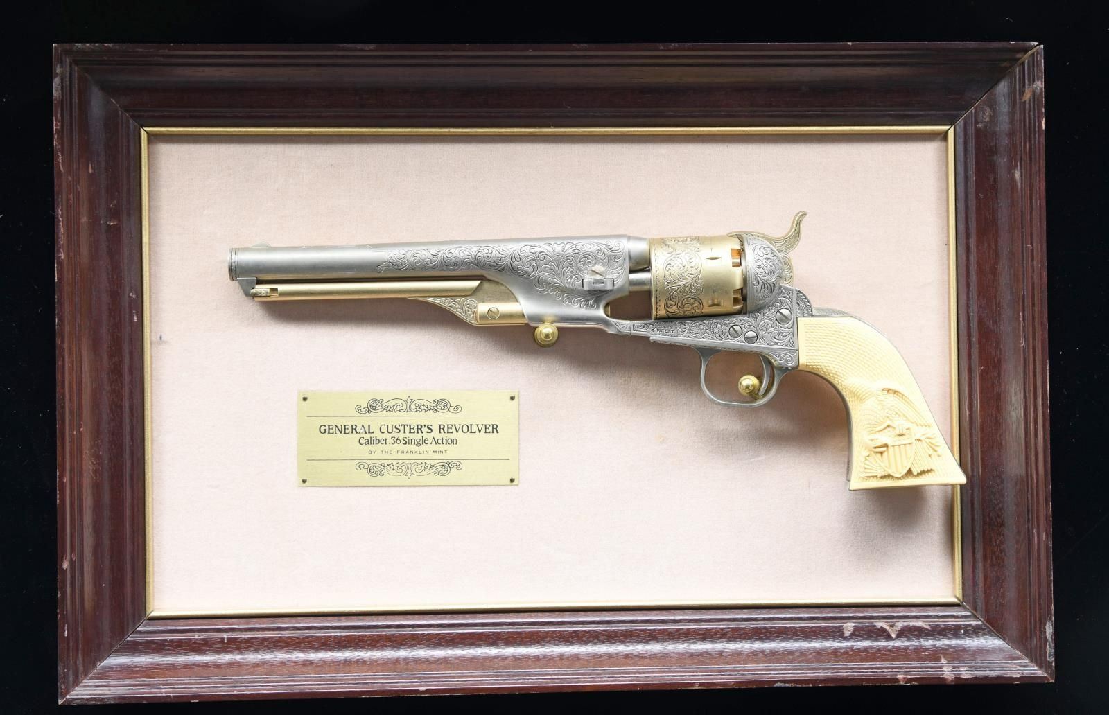 S# 13511. Bbl. 7 1/2" w/ plugged bore. Franklin Mint issued non firing replica of a Colt 1851 Navy revolver to commemorate George Custer. Hammer cocks, cyl. rotates & ejector rod functions. Gold plated, cyl. ejector rod & hammer. Balance of metal has nickel plate finish w/ floral engraving. Checkered faux ivory grips w/ American eagle on left panel. UNATTACHED ACCESSORIES: display frame w/ Franklin Mint plaque. One of the display stands is broken & one of the edges of the frame is separating. CONDITION: all aspects near excellent. (02-21038/MJC). NON-GUN. $100-200.