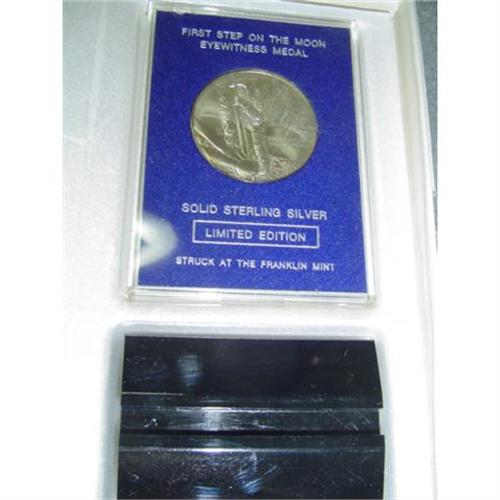 Franklin Mint - Solid Sterling Silver LE "First Step on the Moon Eyewitness Medal." MIB with stand. COA NO. 77182. (2.1 oz in plastic case)