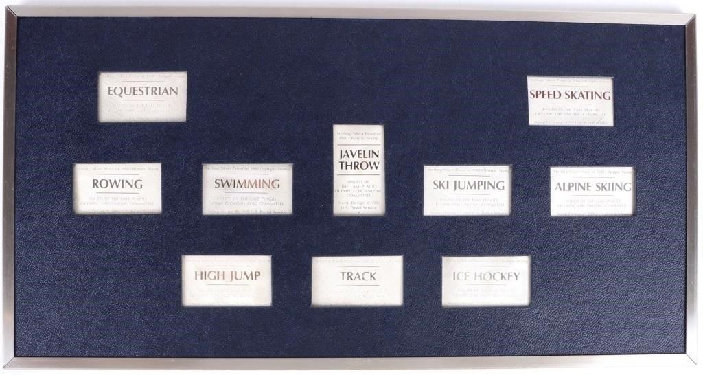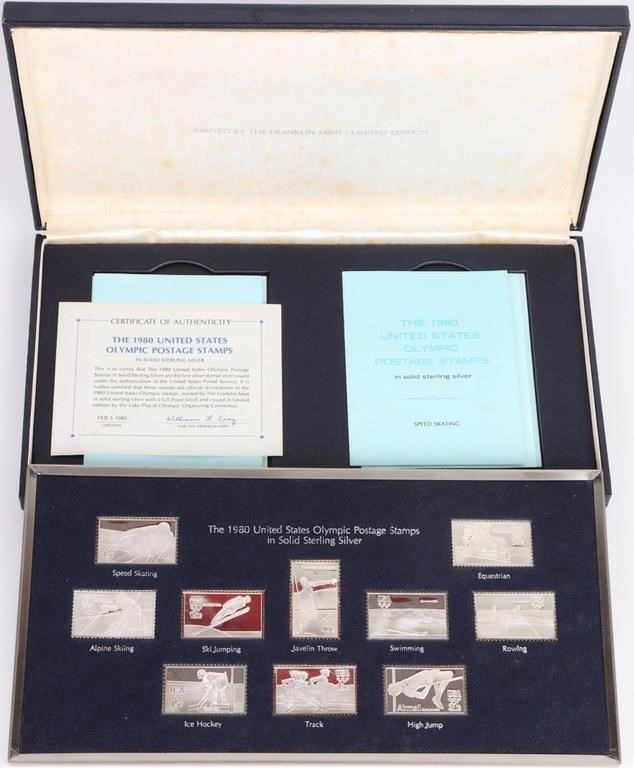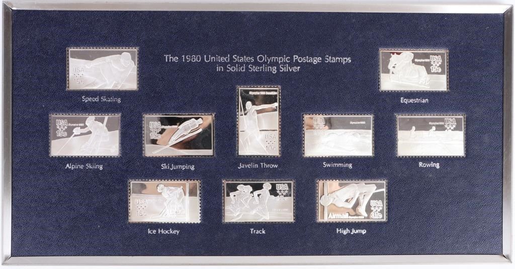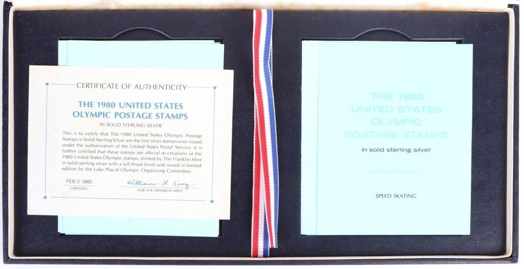 Limited edition Franklin mint 1980 United States Olympic postage stamps in solid sterling silver. These stamps come in the original case along with a certificate of authenticity.