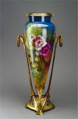Vase,<BR> Bronze, vergoldet, Keramik. Heller Scherben mit ploychromer, floraler Bemalung. Amphorenförmige Vase in reliefierter Bronzefassung. H.. 63 cm. Bez.: Firmenmarke, Mod.Nr. 1860. Um 1900<BR> StadtMuseum Bonn Bonner Keramik. Bestandskataloge des StadtMuseums Bonn, Nr. 3, Hrsg. Ingrid Bodsch. Bonn 1999. S. 185, Abb. 202 (Vgl.).<BR>