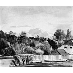 Haus am Isarufer, im Hintergrund die Alpenkette. Sepiapinselzeichnung, ebenso. - Auf leichtem “H BLUM”-Bütten. Größe: 17,9 x 21,4 cm. Mit Einfassungslinie in Bleistift. Minimal fleckig und mit durchscheinenden Klebespuren in den Ecken.