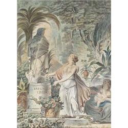 Junge Frau vor einer Äskulapstatue einen Kranz niederlegend.  Aquarellierte Tuschfederzeichnung.  - Größe: 39,2 x 28,6 cm. Verso mit Klebespuren sowie minimal stockfleckig.