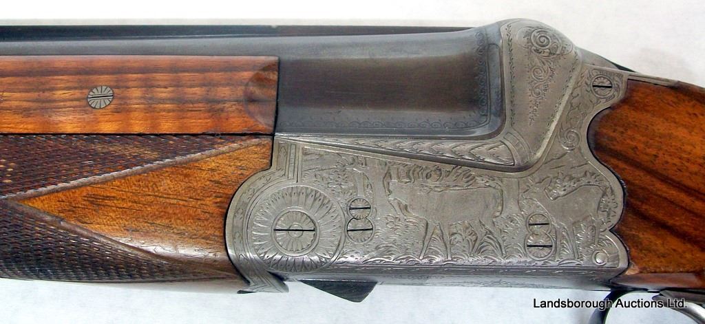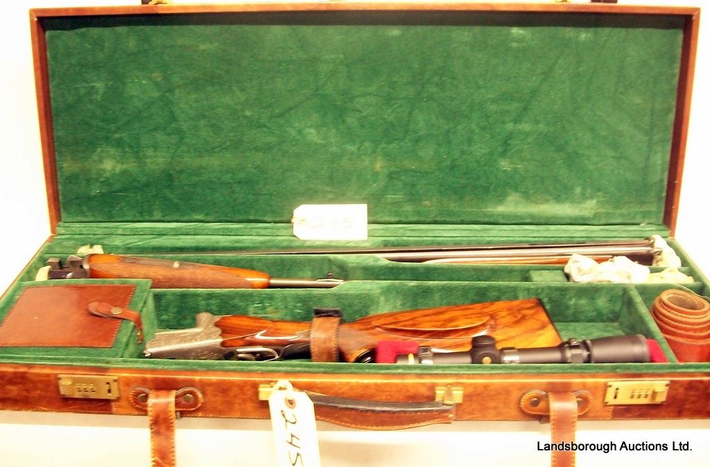 NON-RESTRICTED, MULTI BARREL, 16GA OVER 16GA AND 16GA OVER 30-06 SPRG, 27 1/2" AND 23 1/2 RESPECTIVELY, SN 9329. WOOD HAS SOME HANDLING MARKS, BLUING TURNING GREY, BORES EXCELLENT. COMES WITH LEATHER TAKEDOWN CASE, LEUPOLD VX3 1.5 - 5 X 20 SCOPE, SLING.