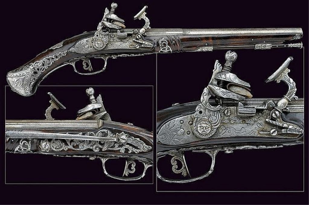 A fine flintlock snaphaunce pistol Smooth, double-edged barrel with rings and acanthus leaves near the girdle, grooved at the first part signed "FRANZINO", 14 mm cal; smooth tang; flat plate lock engraved with floral motifs, hammer, batterie and sp