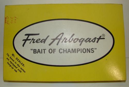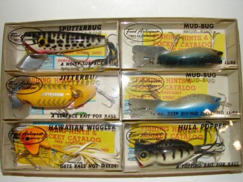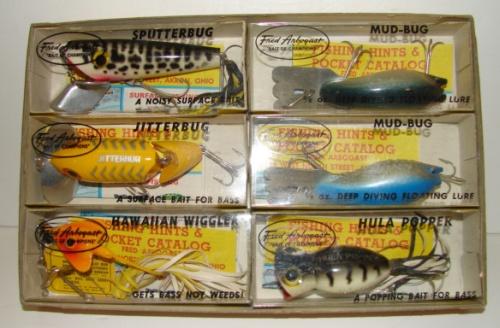 FRED ARBOGAST FISHING LURES. Consists of 6 unopened lures in box. Sputterbug. Jitterbug. Hawaiian Wiggler. Mud-Bug (2). Hula Popper.