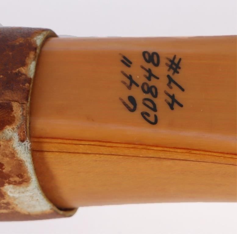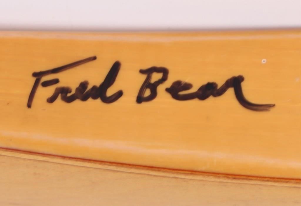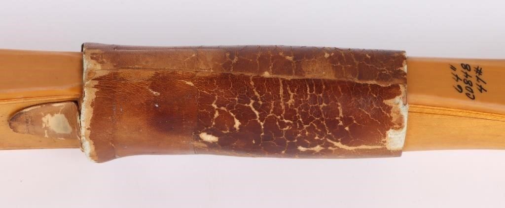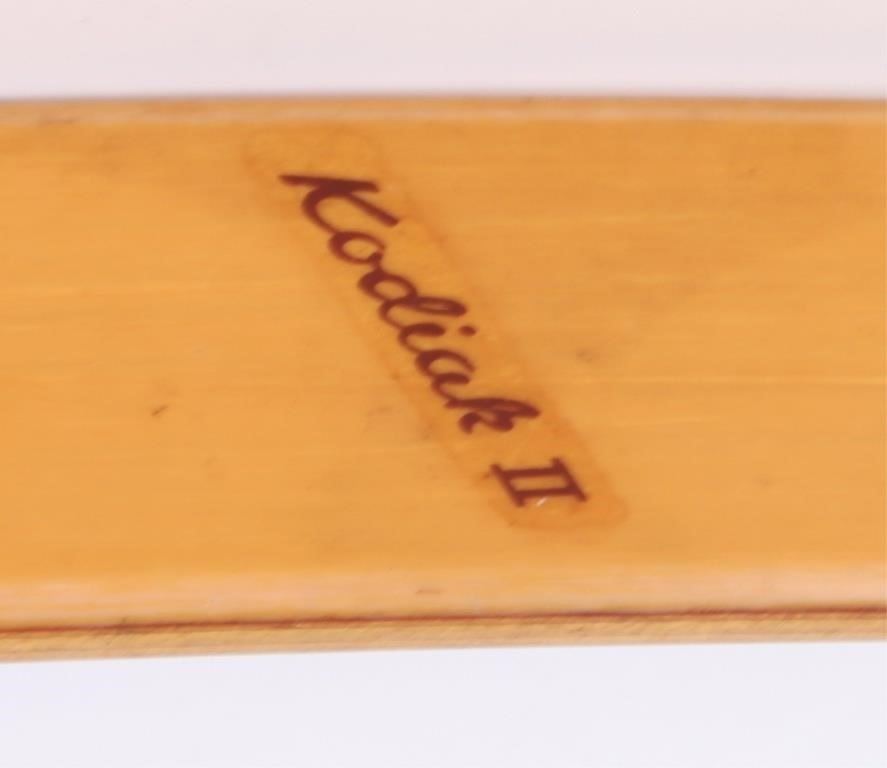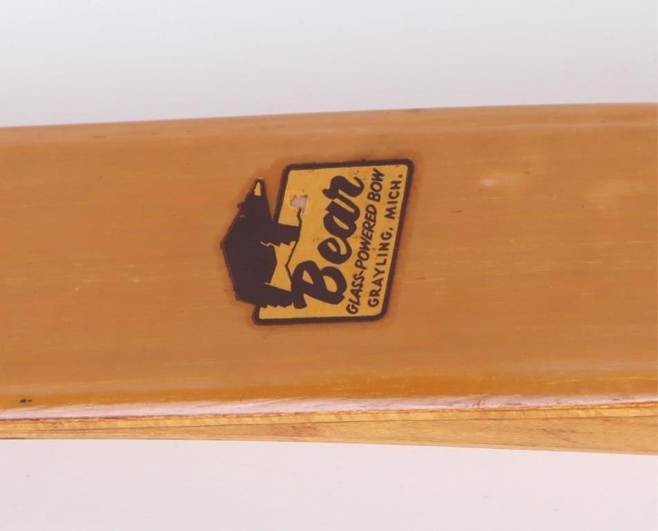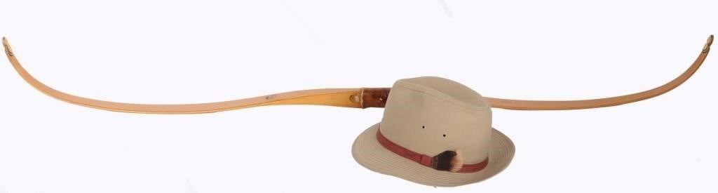 Fred Bear signed original bow and personal hat. The Bear Kodiak II bow includes Bear's signature from his personal use and collection. The Kodiak II bow measures 64", CD848 47#. Bow has inset compass. Bear's hat is one-of-a-kind, as it was worn by bear for his amazing adventures and lifestyle, hat comes with a tucked feather and photo of bear wearing the hat. Bear was an American bow hunter and manufacturer. Although he did not start bow hunting until he was 29 and did not master the skill for many years, he is widely regarded as a pioneer in the bow hunting community. Bear was a world traveler, film producer, and the founder of Bear Archery. He died in Gainesville, Florida and is inducted in the Bowhunters Hall of Fame.
