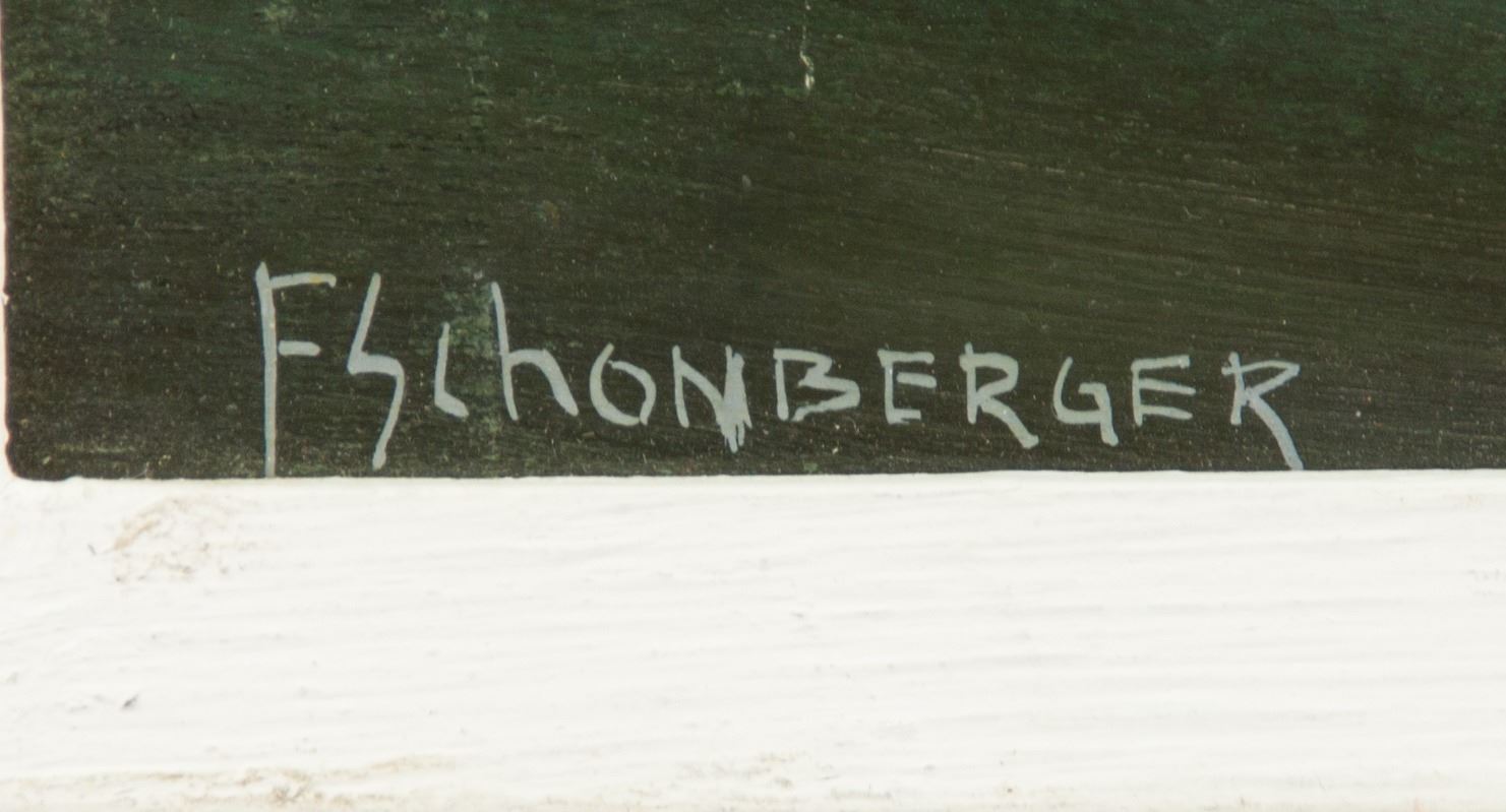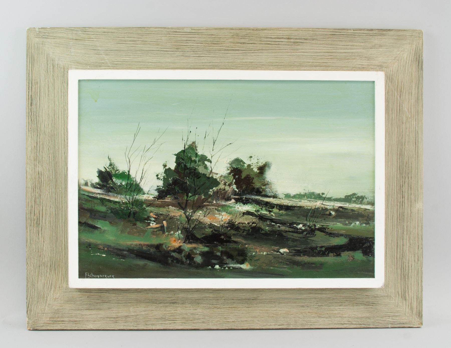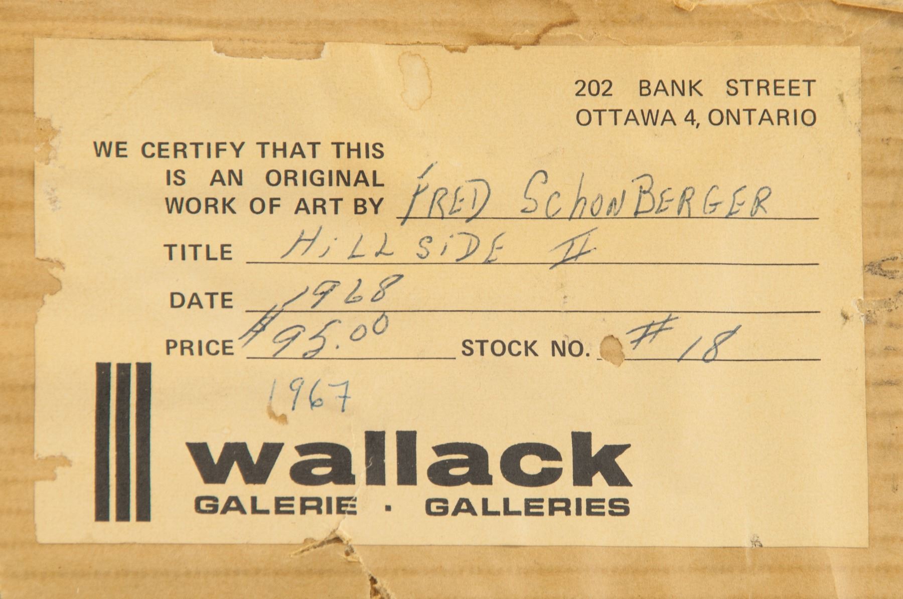 Oil on canvas, framed. Featuring a landscape scene. Signed Fred Schonberger (Canadian, 1930-1993), on the lower left corner. Gallery certificate on verso, by Wallack Galerie, Ottawa, Ontario. Titled "Hillside II", dated 1968. 33 x 48 cm (13 x 18.9 in.).