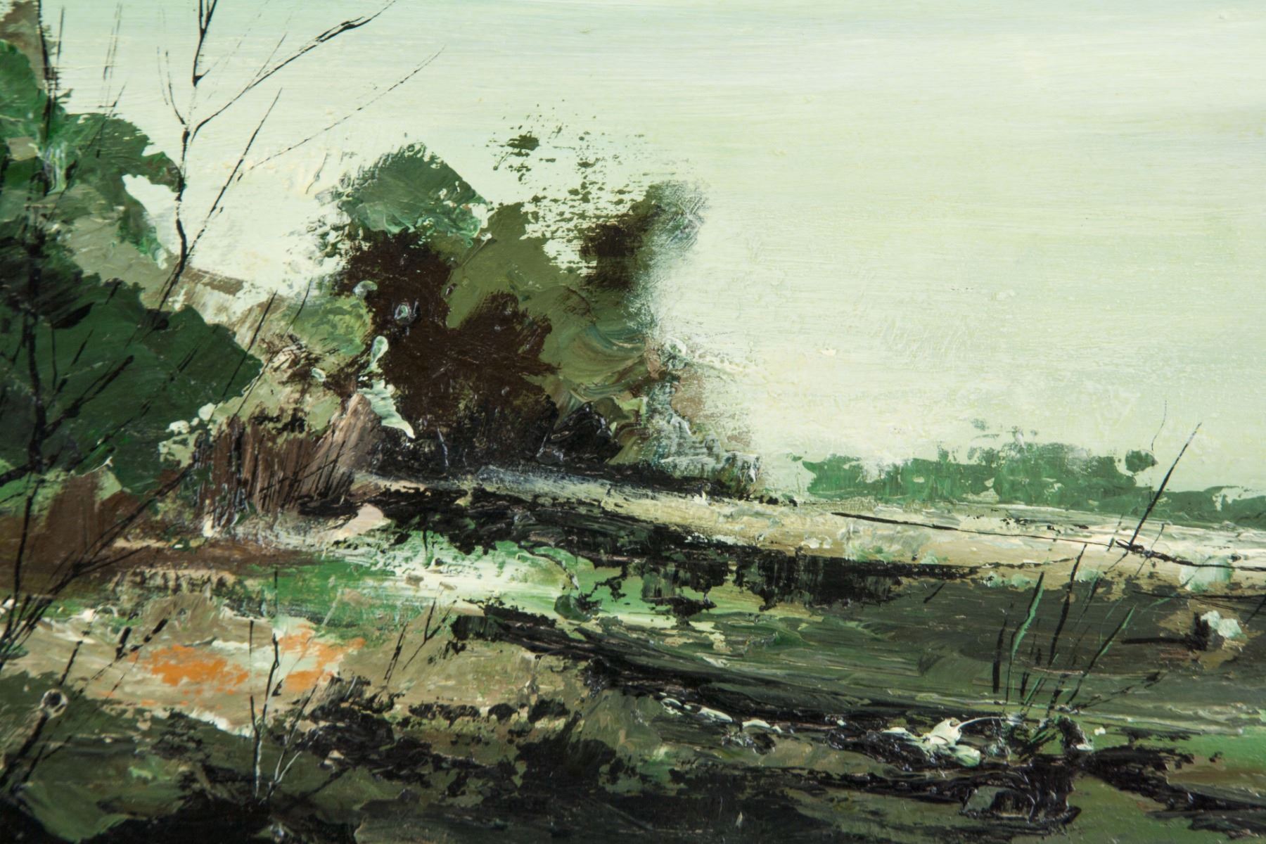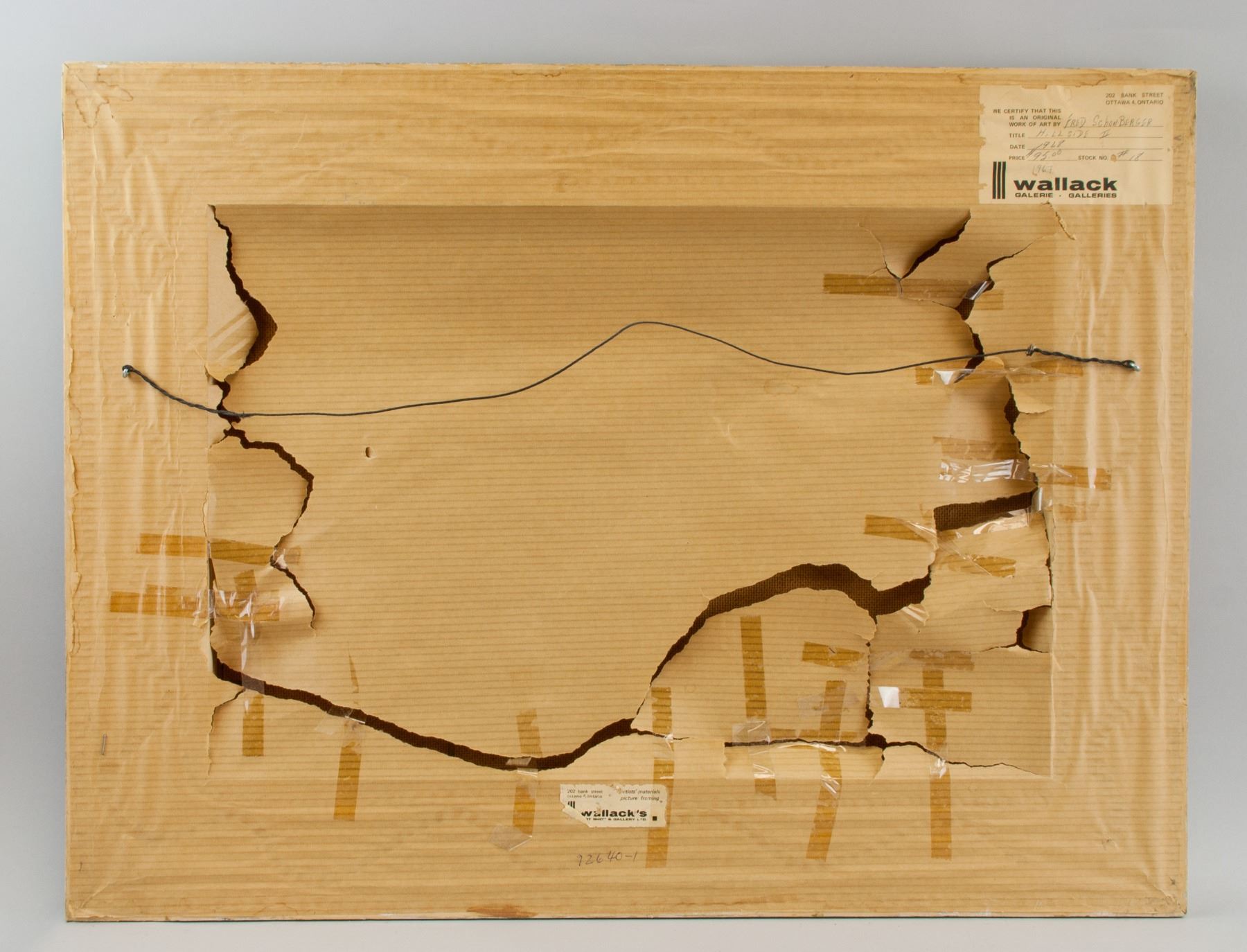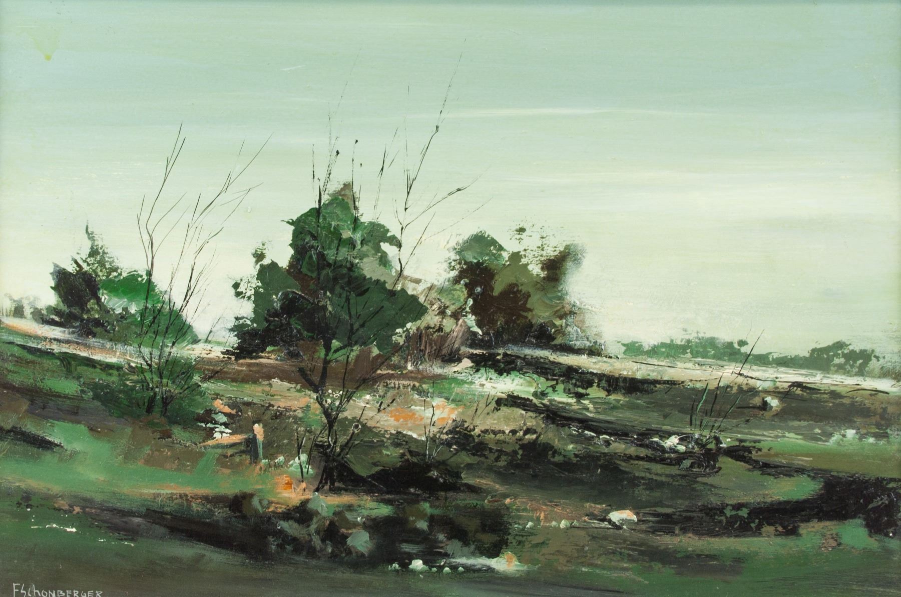 Oil on canvas, framed. Featuring a landscape scene. Signed Fred Schonberger (Canadian, 1930-1993), on the lower left corner. Gallery certificate on verso, by Wallack Galerie, Ottawa, Ontario. Titled "Hillside II", dated 1968. 33 x 48 cm (13 x 18.9 in.).