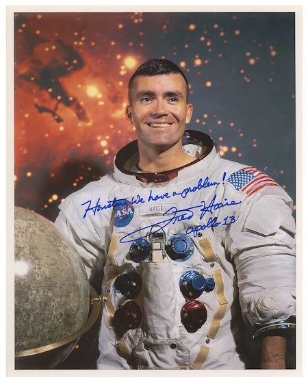 (b. 1933) American astronaut who flew on the ill-fated Apollo 13 mission. Fine S.P. 8" x 10" color, a great shot of Haise in flight suit standing beside a globe of the moon. Boldly signed in blue marker: "Houston, we have a problem! Fred Haise Apollo 13". Along with WALTER SCHIRRA, a formal shot boldly signed in blue marker, and CLYDE C. TOMBAUGH: "Discoverer of the 9th planet, Pluto Clyde W. Tombaugh Feb. 18, 1930". Three pieces, fine condition.