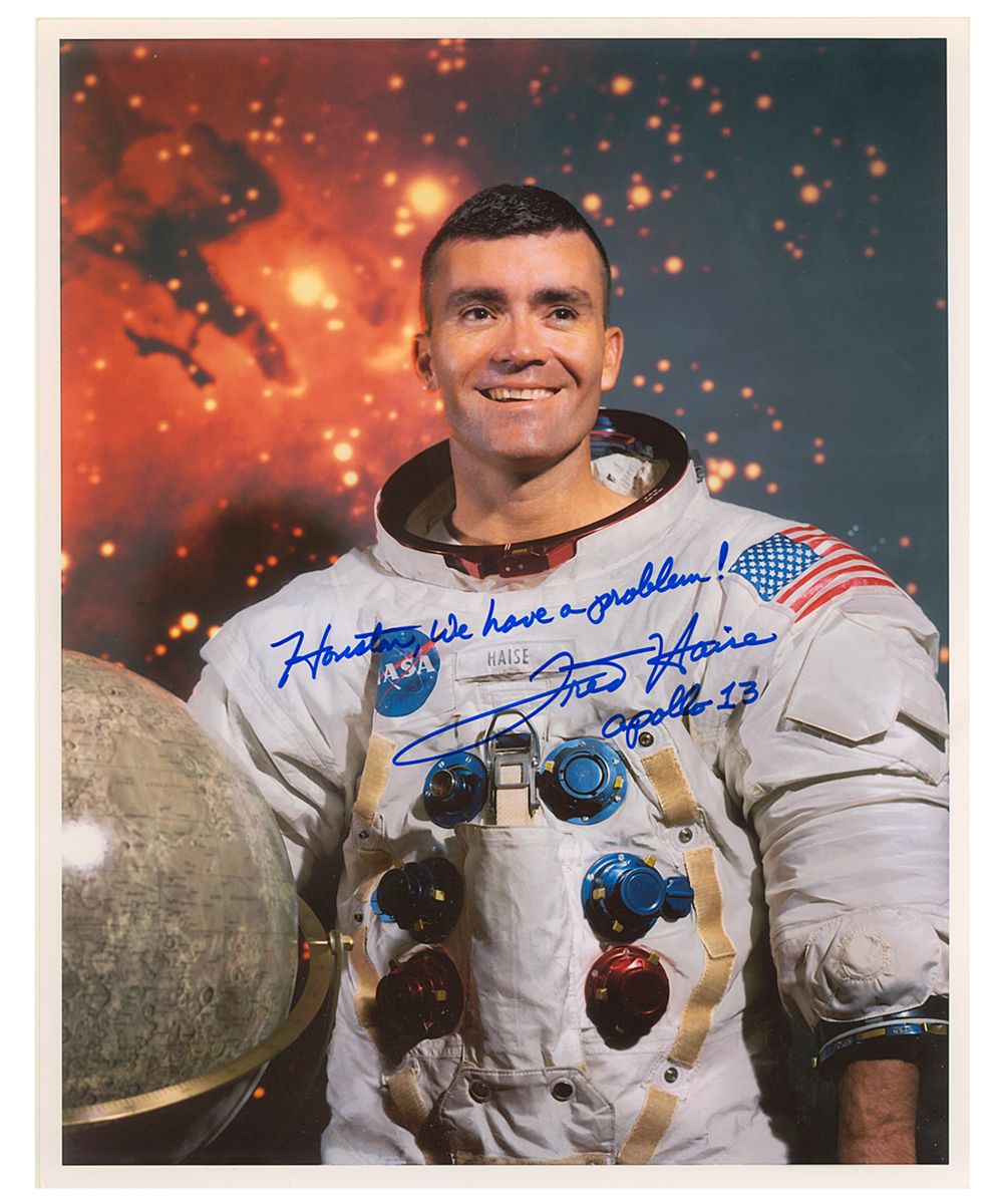 (b. 1933) American astronaut who flew on the ill-fated Apollo 13 mission. Fine S.P. 8" x 10" color, a great shot of Haise in flight suit standing beside a globe of the moon. Boldly signed in blue marker: "Houston, we have a problem! Fred Haise Apollo 13". Along with WALTER SCHIRRA, a formal shot boldly signed in blue marker, and CLYDE C. TOMBAUGH: "Discoverer of the 9th planet, Pluto Clyde W. Tombaugh Feb. 18, 1930". Three pieces with very minor marginal dings, else fine condition.