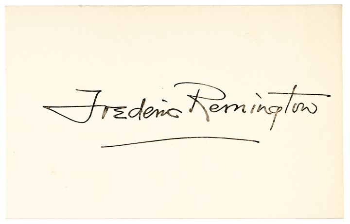 Bold Signature, “Frederic Remington” upon 3.75” x 2.5” white card, no date or place, Choice Near Mint. An example of Remington’s most lovely and “Formal” signature style, as he used a more informal version in his regular correspondence. A gorgeous example.