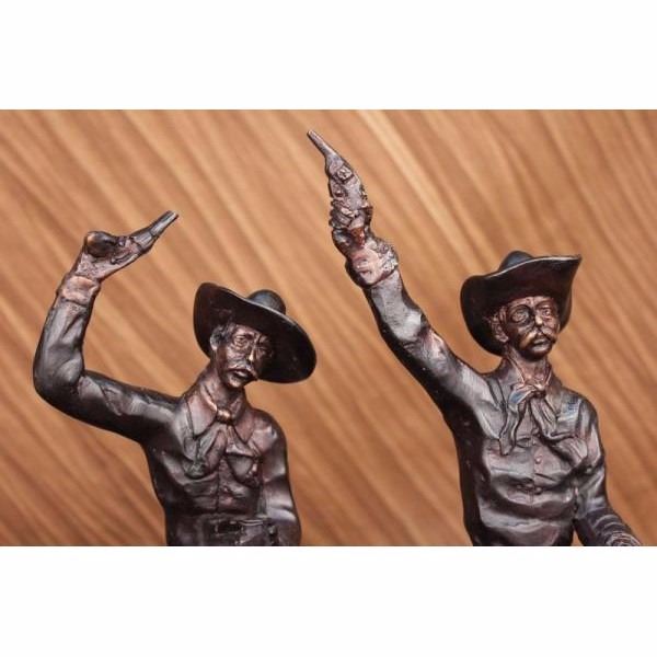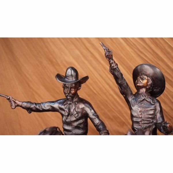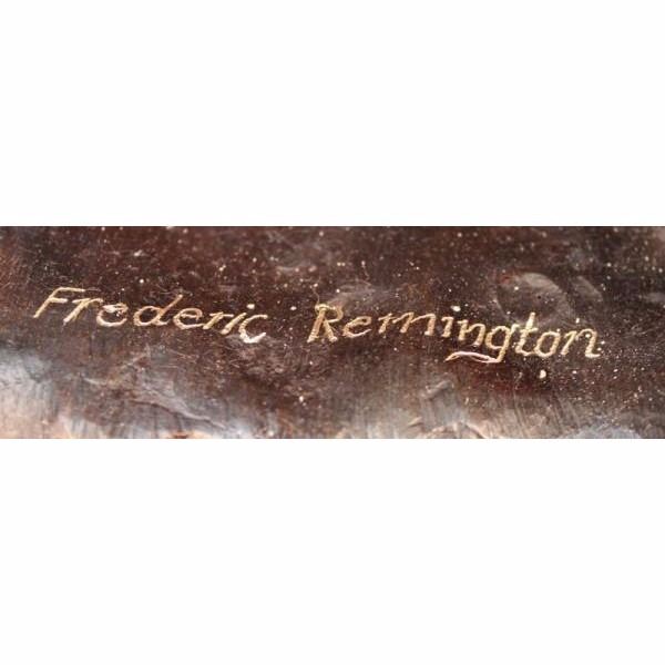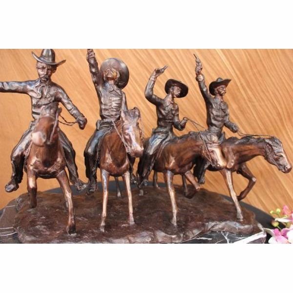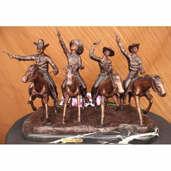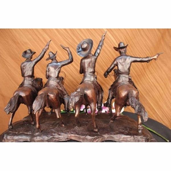Here ridefour cowboys, in unison with each other and their horses. They are a team of friends that roam the land together, a force to be reckoned with in their own right. Pistols held high up to the sky they fire rounds and enjoy this time together as their horses gallop at full speeds. They wear the same outfits; a nomad cowboy getup of chaps, spurred boots, collared button down long sleeved shirts and wide brimmed cowboy hats. They are all four around the same age, assumed to be the 50s, and they all also have mustaches. They are true friends and share a level of companionship few are lucky enough to experience, inseparable by anything. A two tone brown patina is used and this sculpture is crafted by hand using the ancient Lost Wax Method. Signed Frederic Remington.Frederic Remington (1861-1909) was local to New York. He left when he was 19 to explore the Wild West and ended up running a Kansas horse ranch for a while before he left to come back to the East due to its failure. He did however learn many tools that he would later use in his artwork. He is quoted saying No one can draw equestrian subjects unless he is an equestrian himself. He learned everything he could about horses, how they move, react, and look right down to the skeletal and muscular structures. He uses all of these elements in his art. He was mainly a painter through his life and didnt start doing sculptures until the last 14 years of his life. He became well admired by many people including President Theodore Roosevelt who felt that he portrayed a most characteristic and yet vanishing type of American life. Condition: This sculpture is in perfect condition. Bronze Dimensions with Marble Base:Height 18" x Width 28" Marble Dimensions: 13 1/2" X 22". Height without base: 17" Weight : 80 LBS Inventory :45-50476M28054