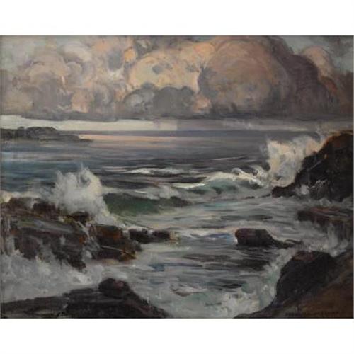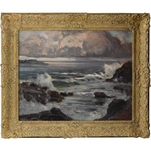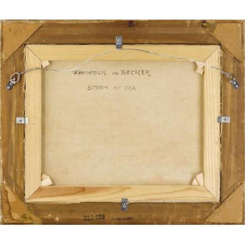 <B>FREDERICK W. BECKER (1888-1974)</B></I><BR><I>Storm at Sea</B></I><BR>Oil on canvas<BR>16 x 20 inches (40.6 x 50.8 cm)<BR>Signed lower right<BR>Signed and titled verso<BR><BR> In the 1950s, Frederick Becker left San Antonio and moved to California. This dramatic painting of a coastal storm is likely a California scene.<B>Condition Report:</B> Excellent condition. Period frame in excellent condition.<BR><BR><b>Shipping:</b> Requires 3rd Party Shipping (<a target="_blank" href="http://www.heritageauctions.com/common/shipping.php">view shipping information</a>)